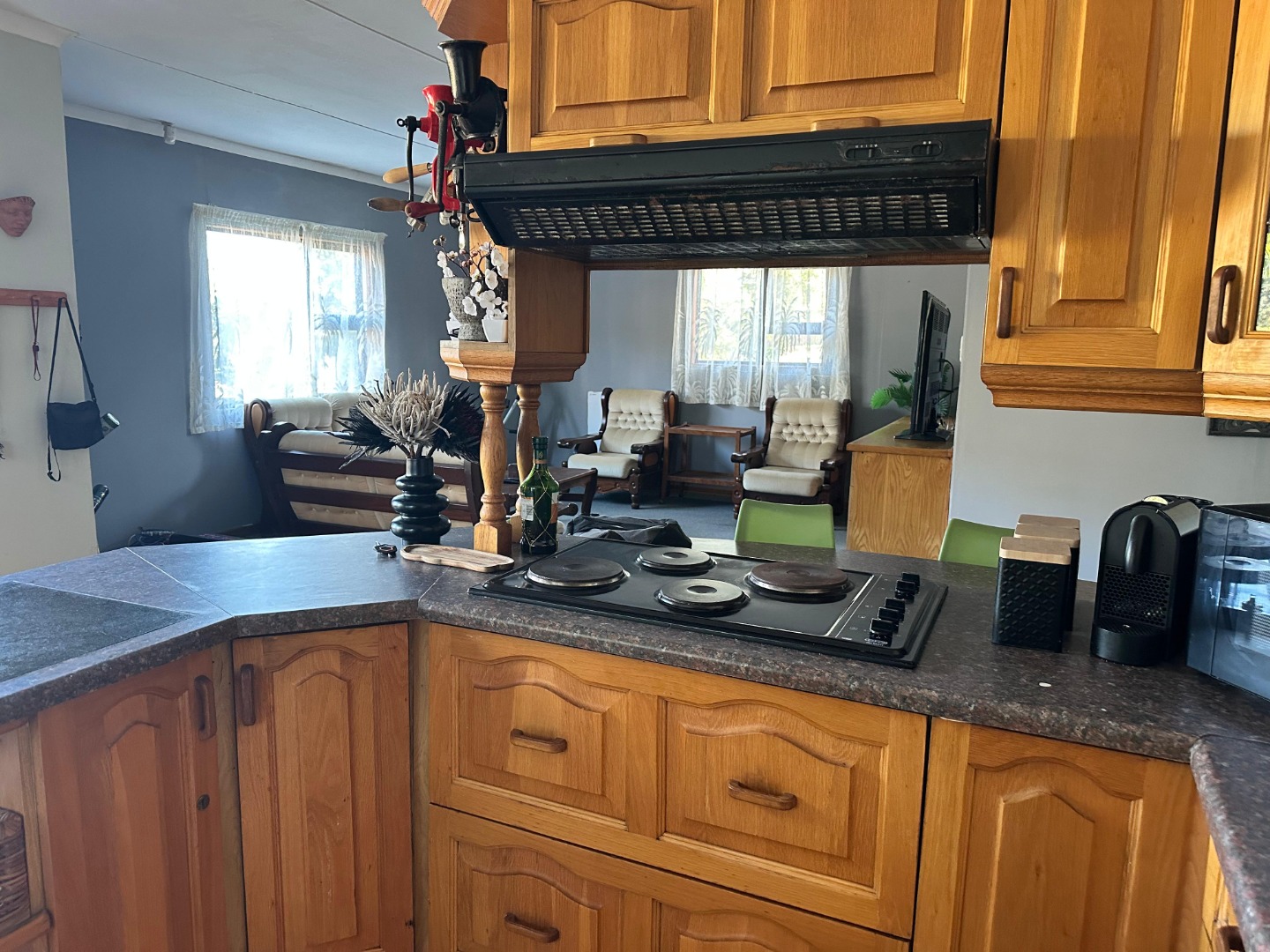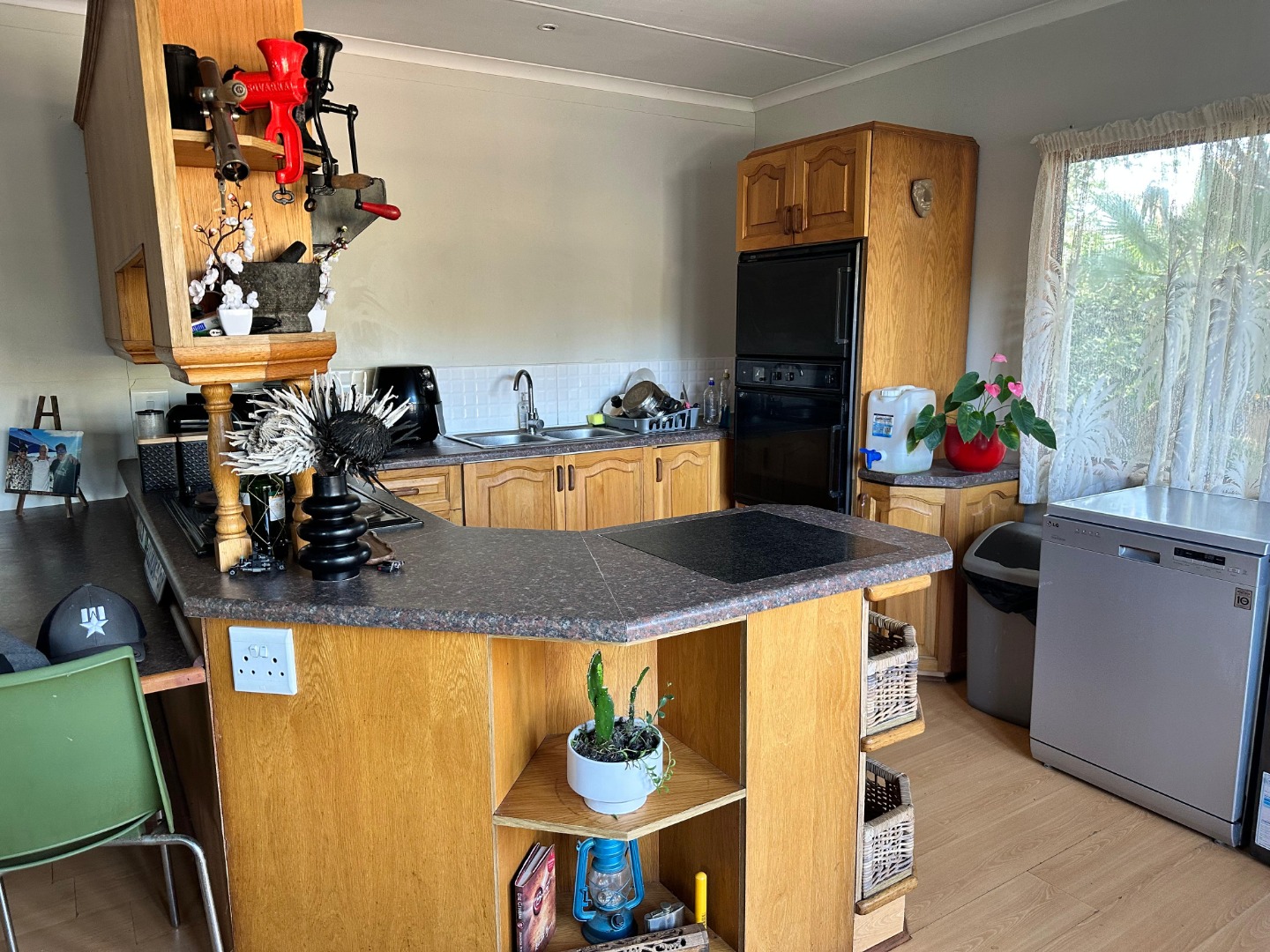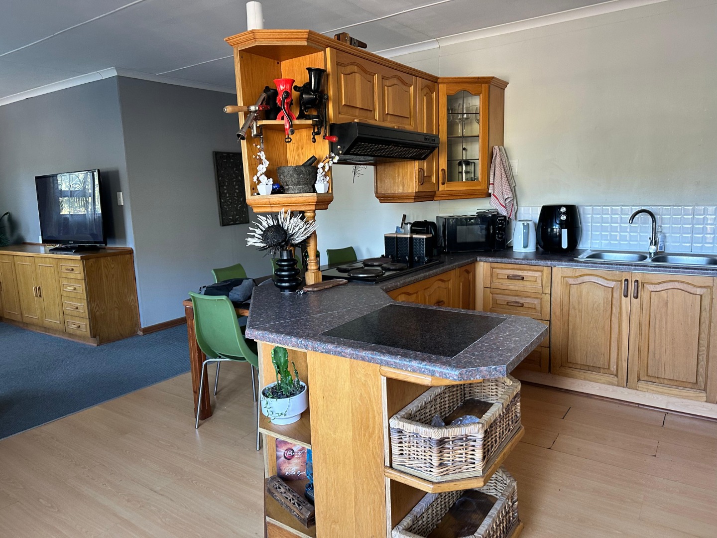 Step inside and you'll find a spacious, carpeted lounge area flooded with natural light from big windows, offering lovely views. There's even a cozy dining counter integrated into the open-plan space, perfect for your morning coffee or a casual meal. The kitchen is a real gem with classic wooden cabinets, loads of counter space, a built-in stovetop, and it comes fully equipped with most modern appliances – so you're all set to whip up some tasty treats!