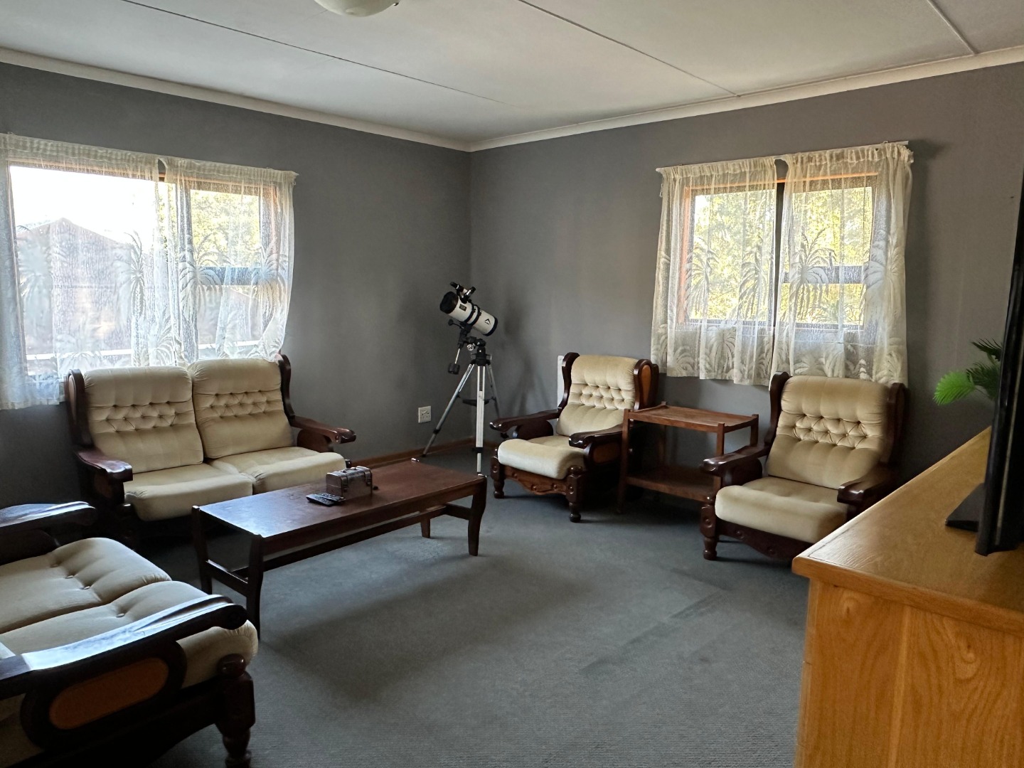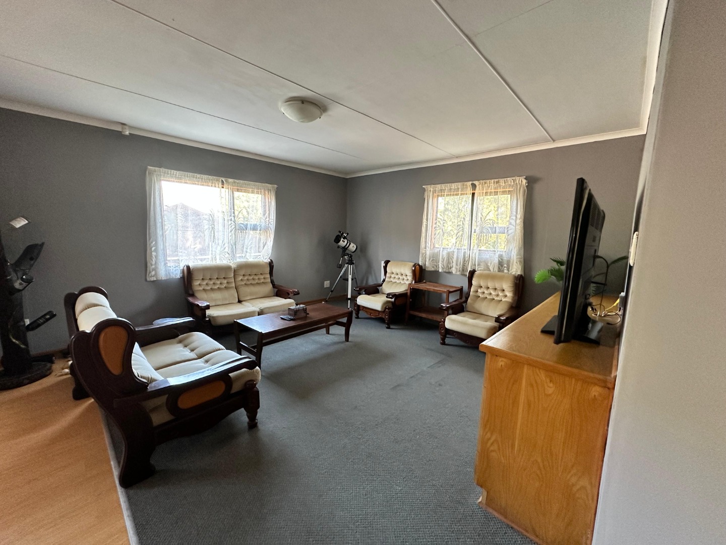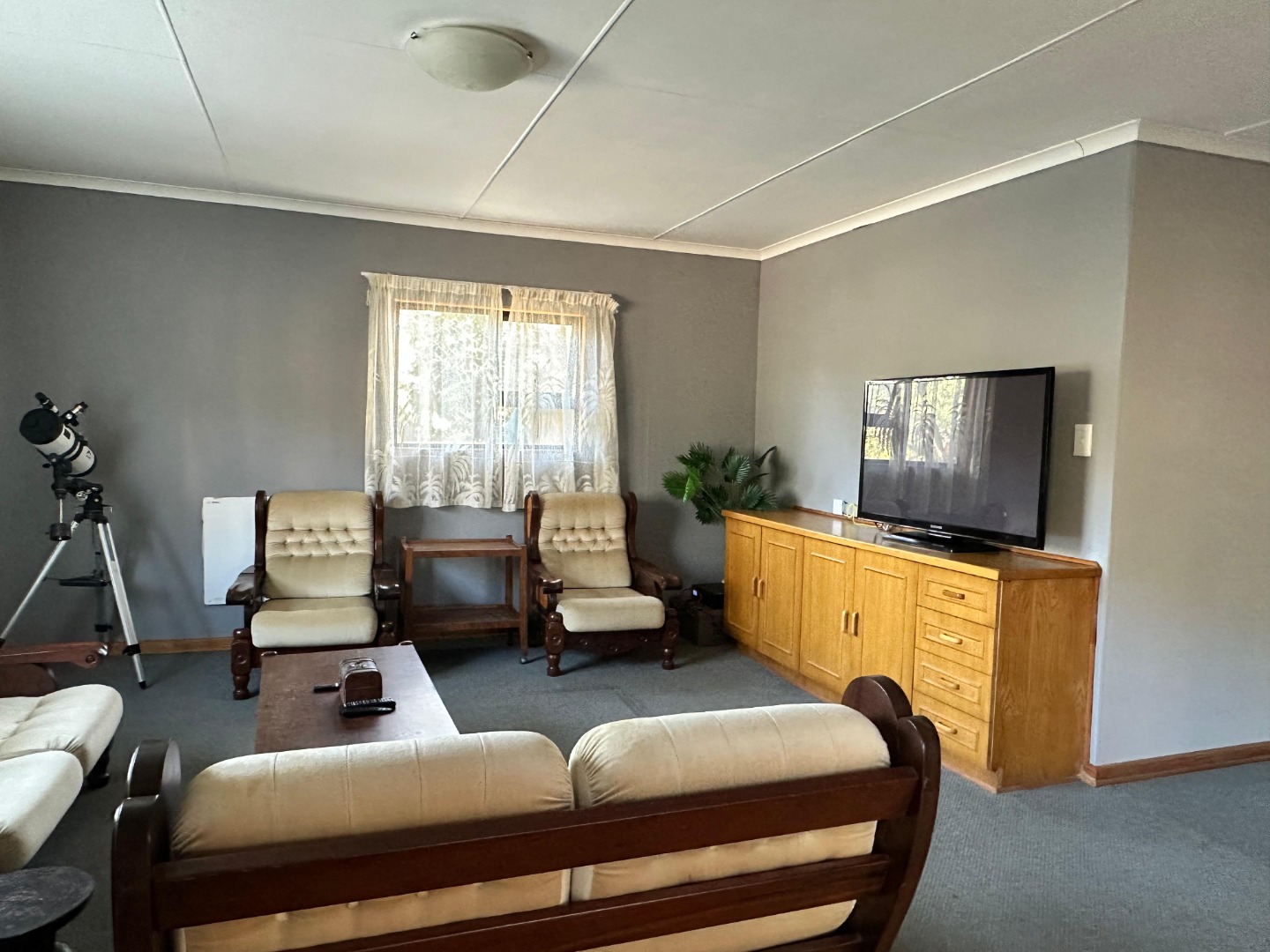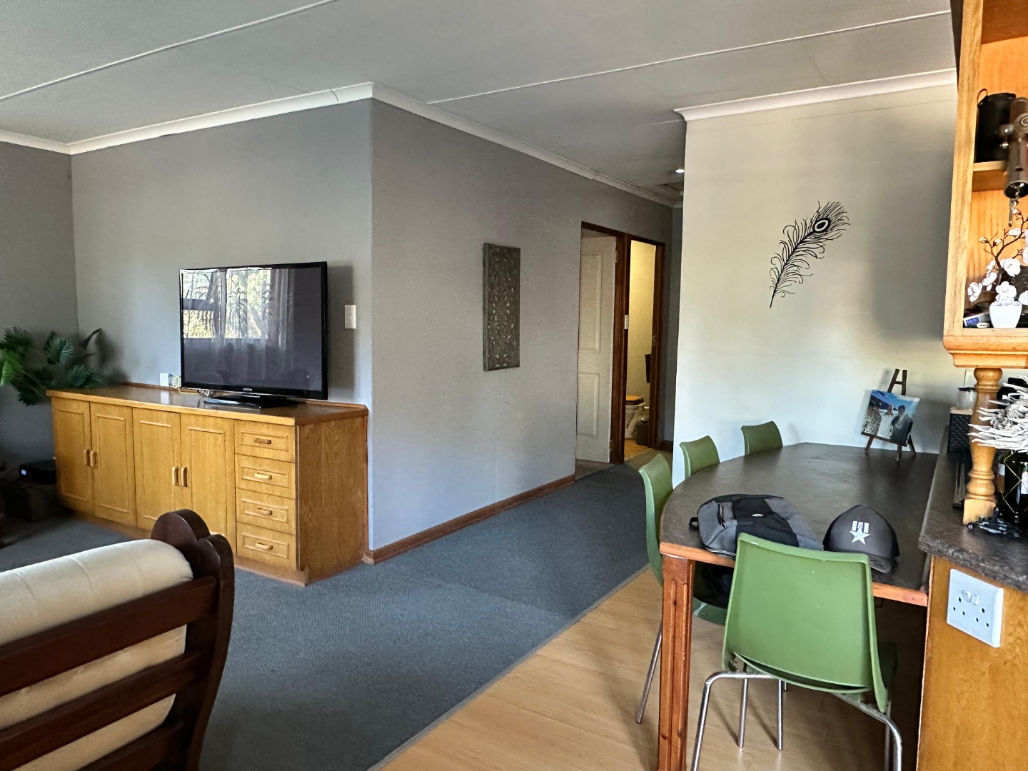 Step inside and you'll find a spacious, carpeted lounge area flooded with natural light from big windows, offering lovely views. There's even a cozy dining counter integrated into the open-plan space, perfect for your morning coffee or a casual meal. The kitchen is a real gem with classic wooden cabinets, loads of counter space, a built-in stovetop, and it comes fully equipped with most modern appliances – so you're all set to whip up some tasty treats!