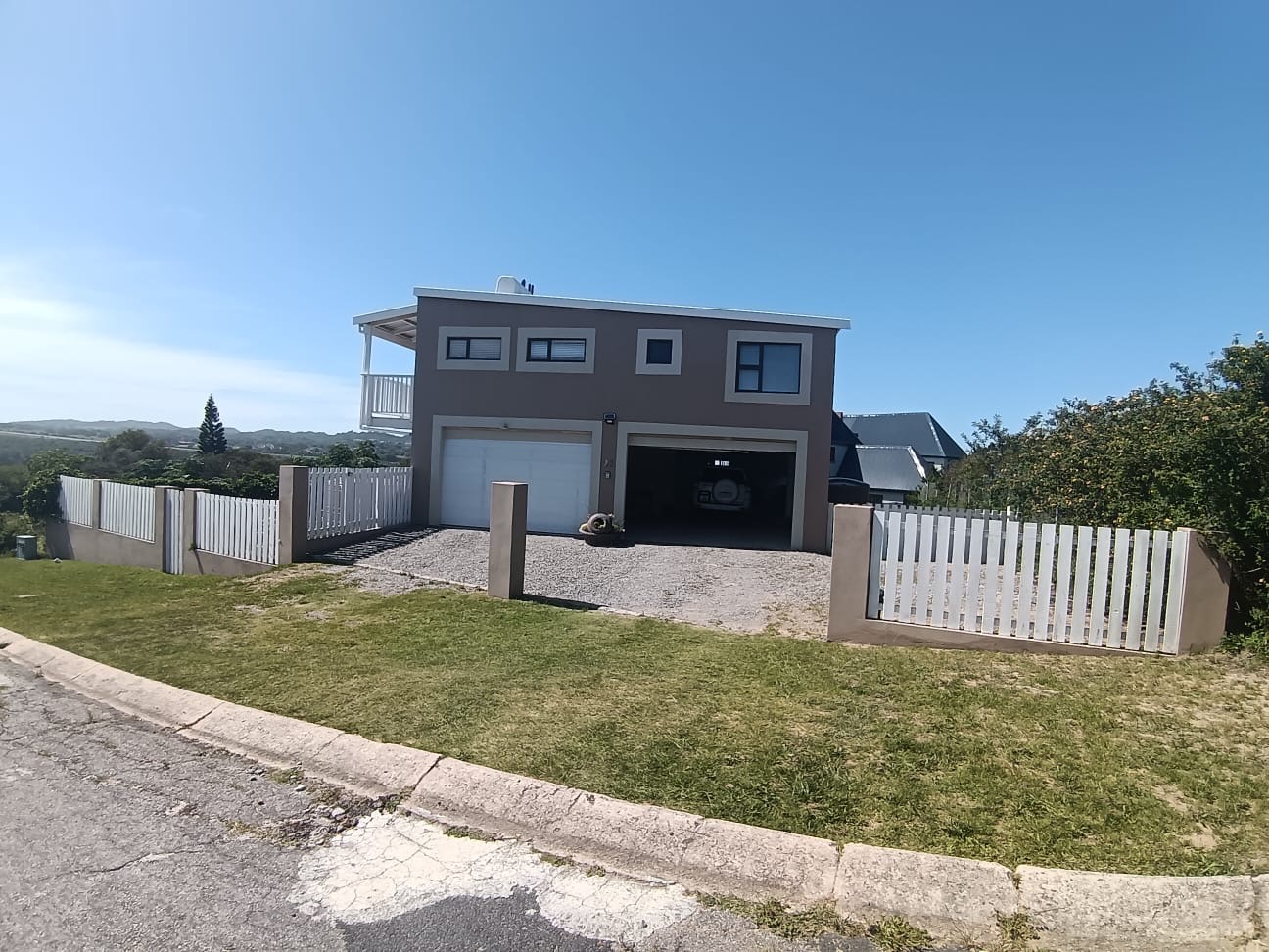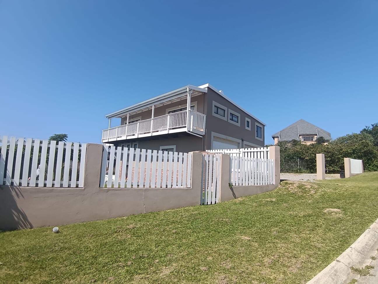 This modern two-story residence in Kleinemonde presents an inviting kerb appeal with its earth-toned exterior, crisp white trim, and a charming white picket fence. A double garage, workshop, and neatly maintained lawn complete the welcoming frontage of this coastal family home.