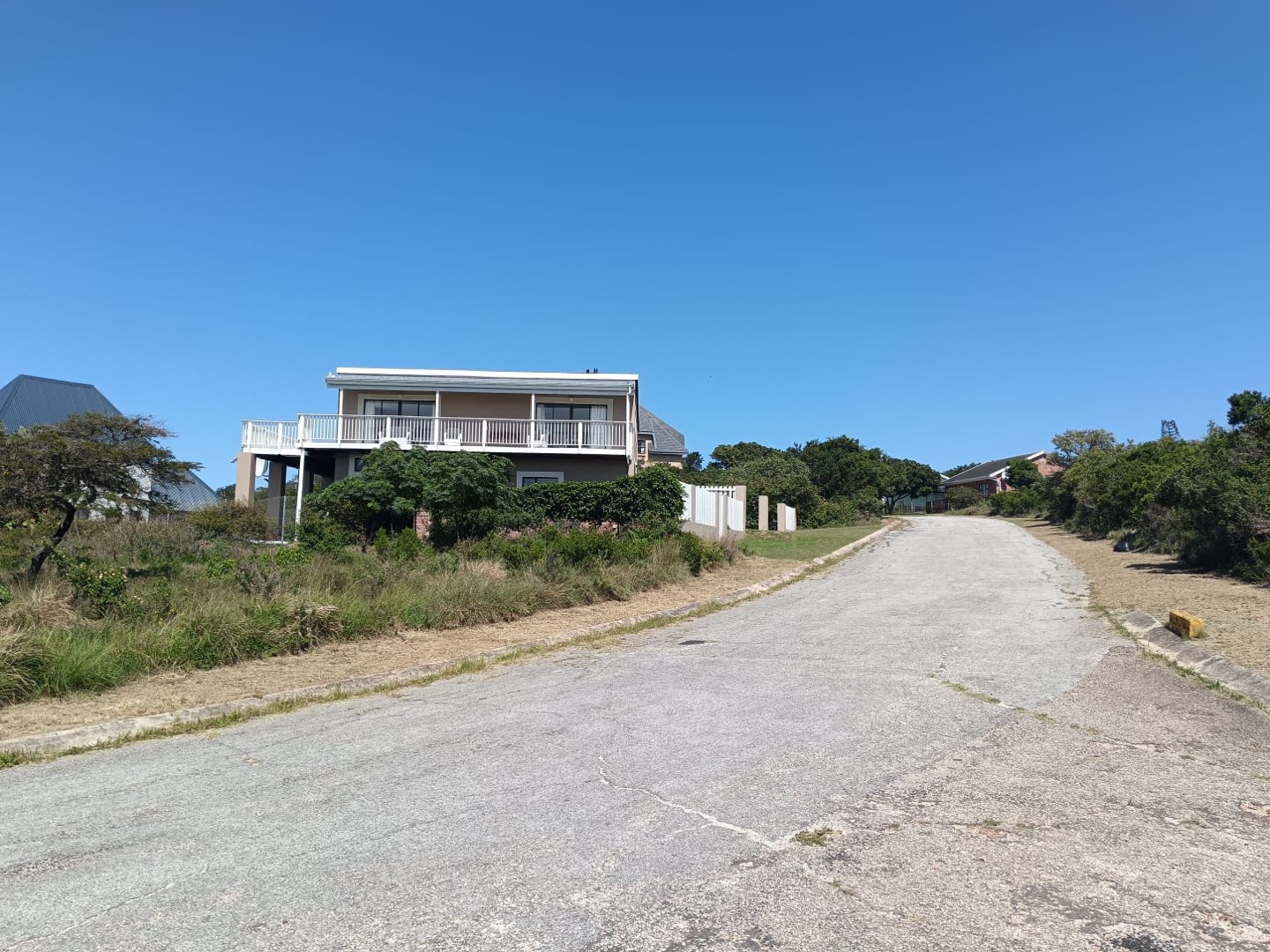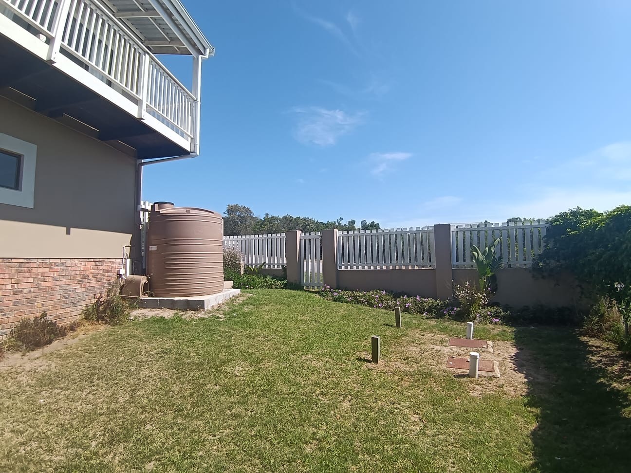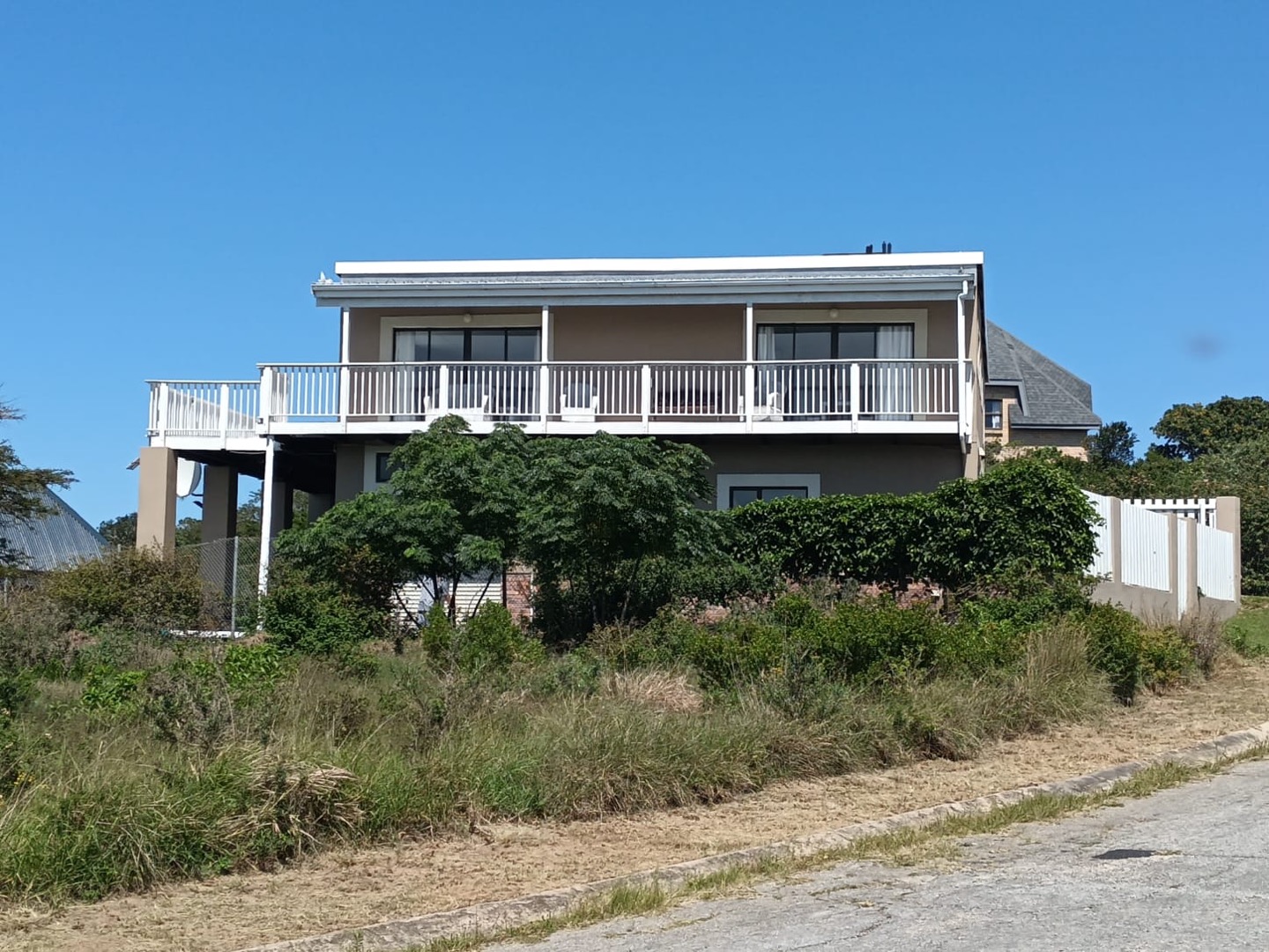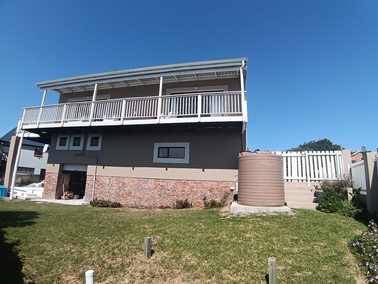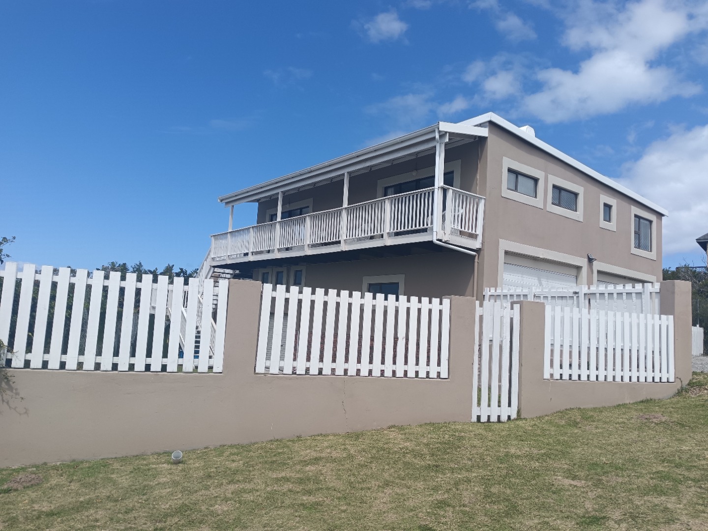 This modern two-story residence in Kleinemonde presents an inviting kerb appeal with its earth-toned exterior, crisp white trim, and a charming white picket fence. A double garage, workshop, and neatly maintained lawn complete the welcoming frontage of this coastal family home.