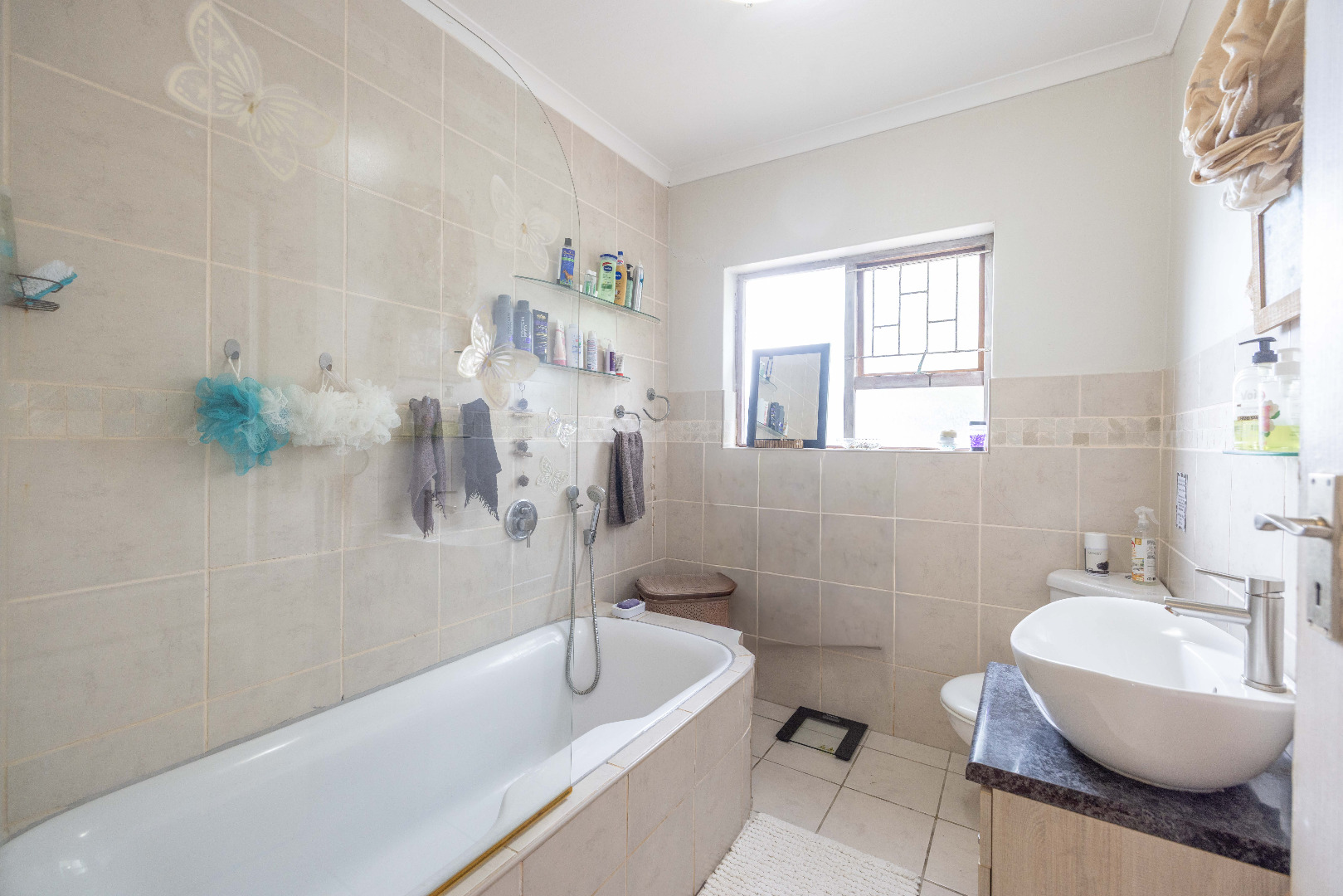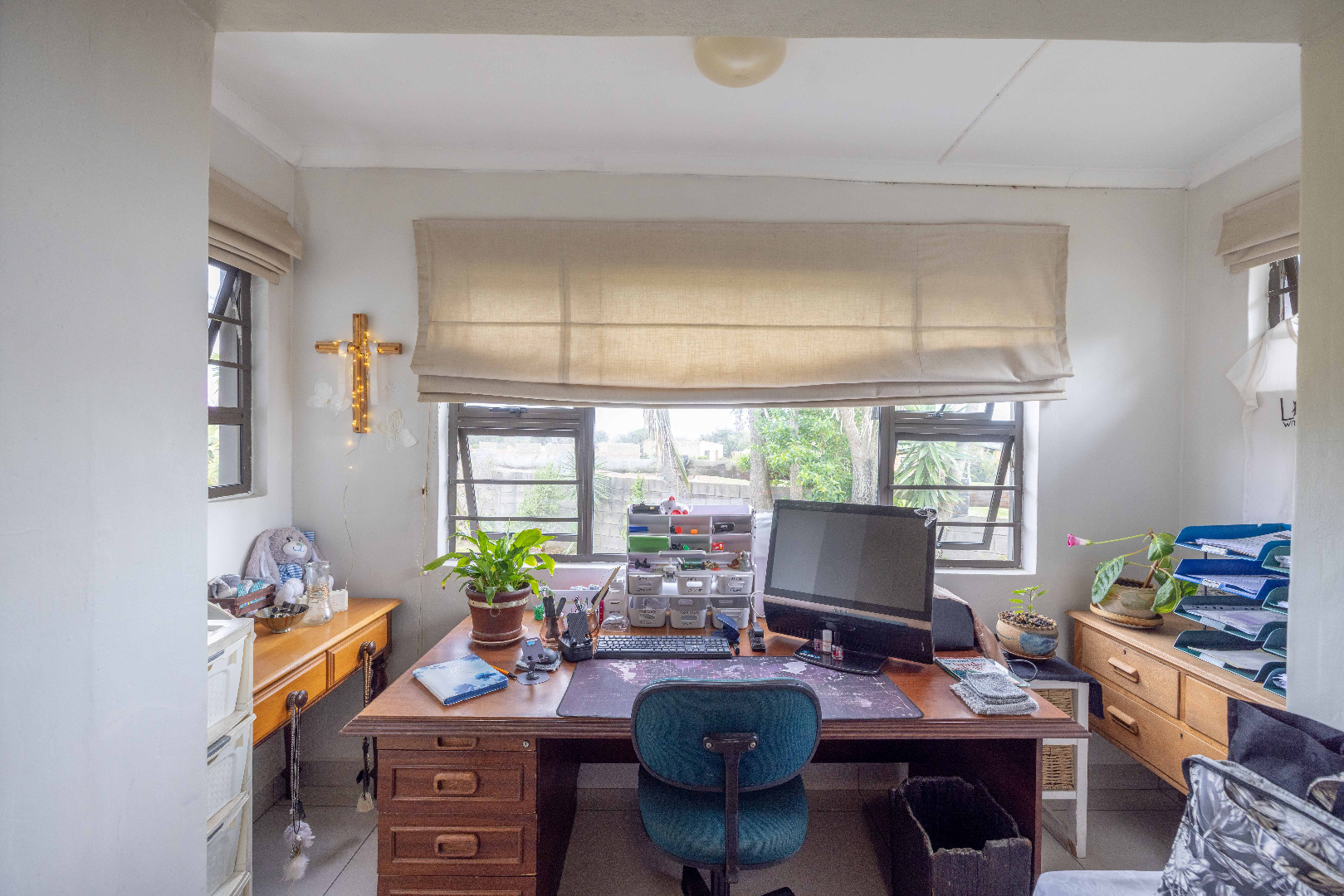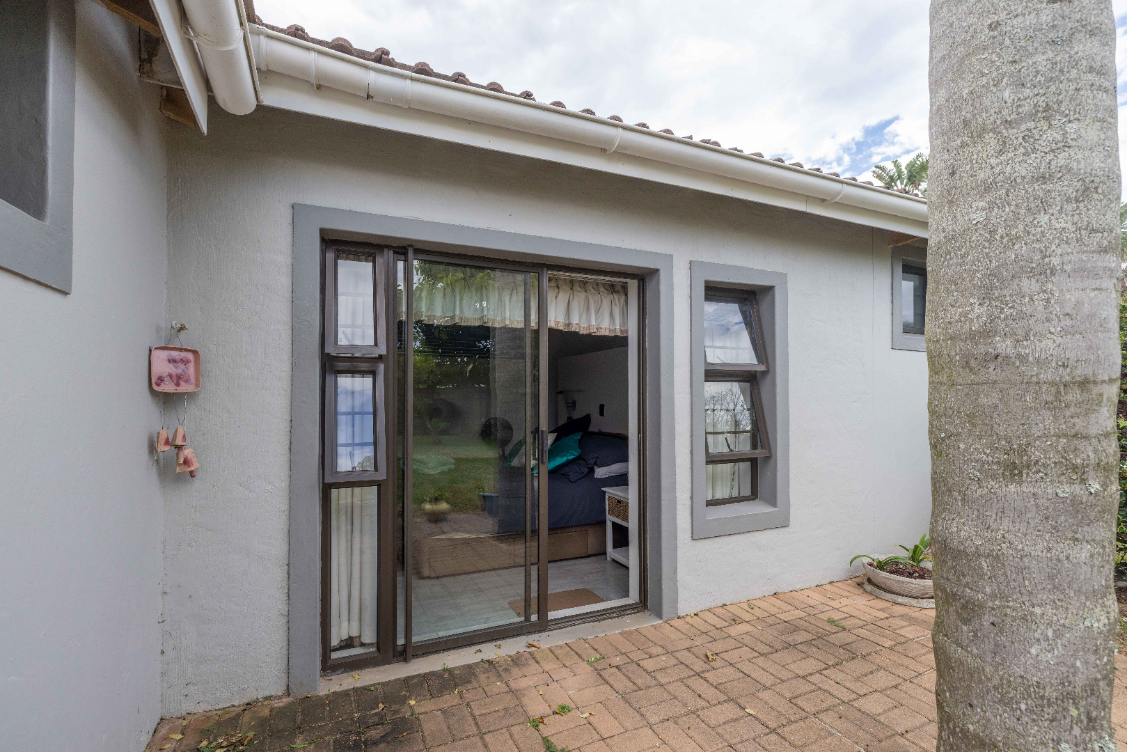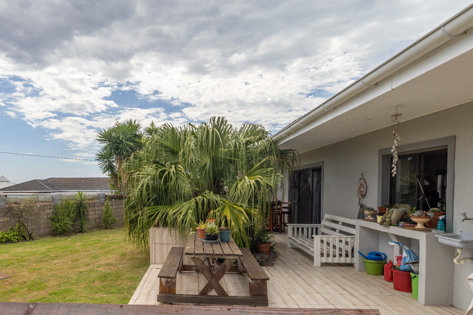 Outdoor living is a highlight, with a large private garden featuring established trees and lush greenery. A spacious patio area, complete with a built-in braai, is perfect for outdoor dining and entertaining guests. The property has water tanks and there is plenty of space for cars to park. The home is totally walled making it an ideal family home great for the kids and pets.