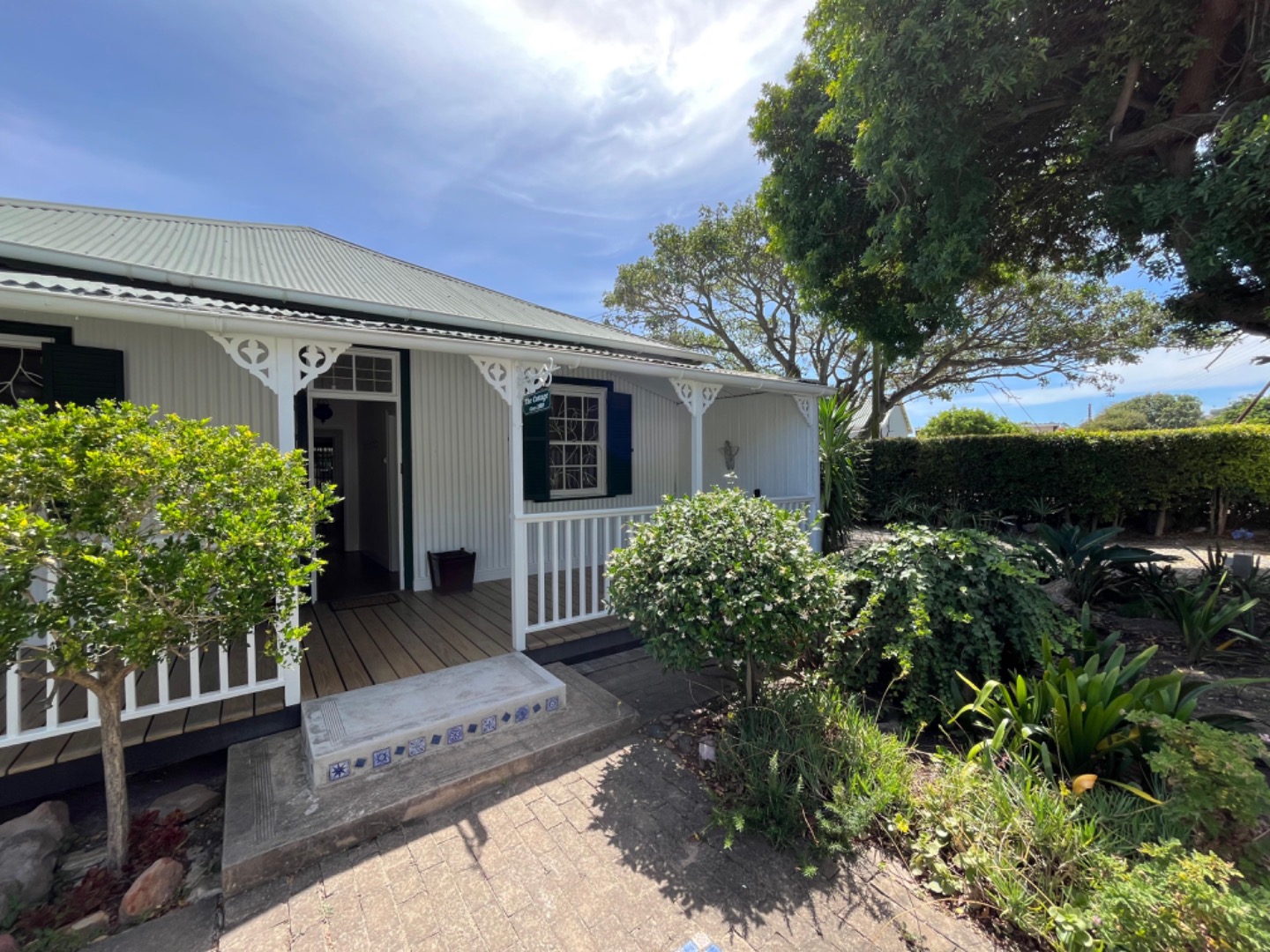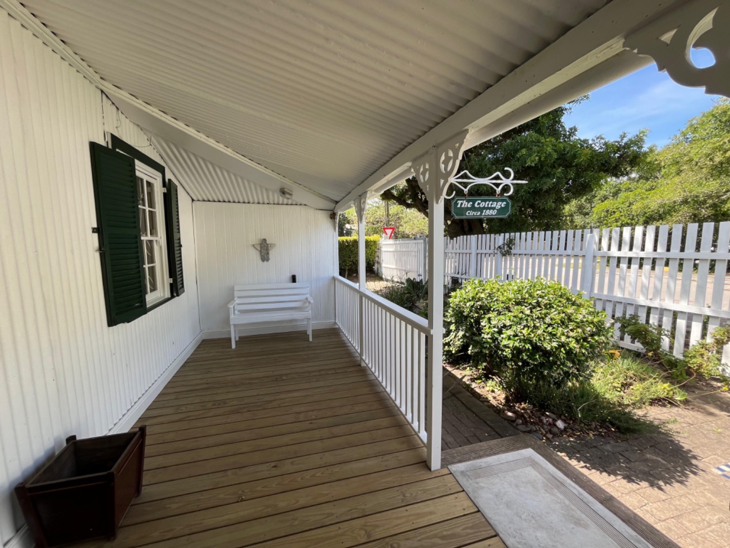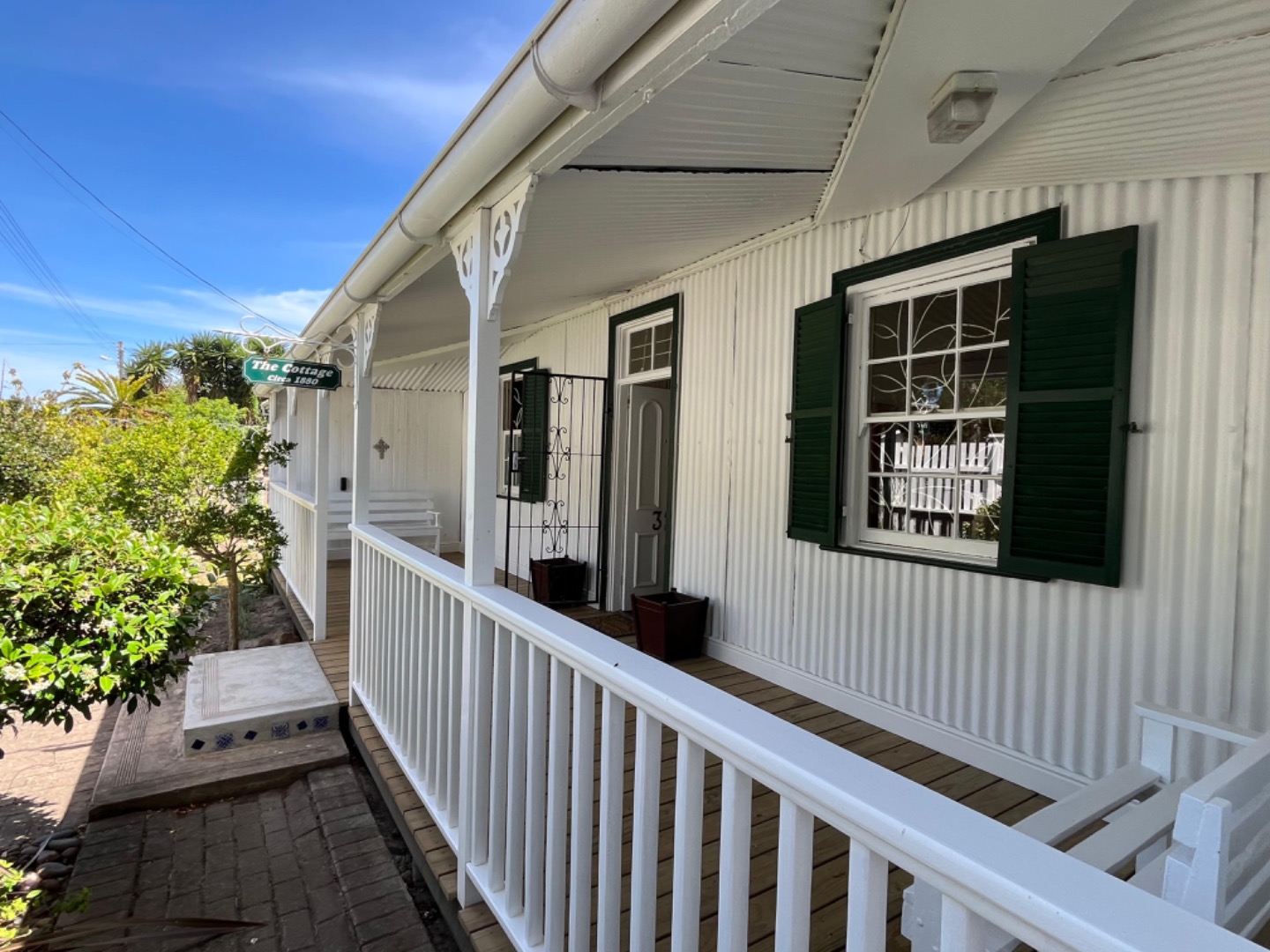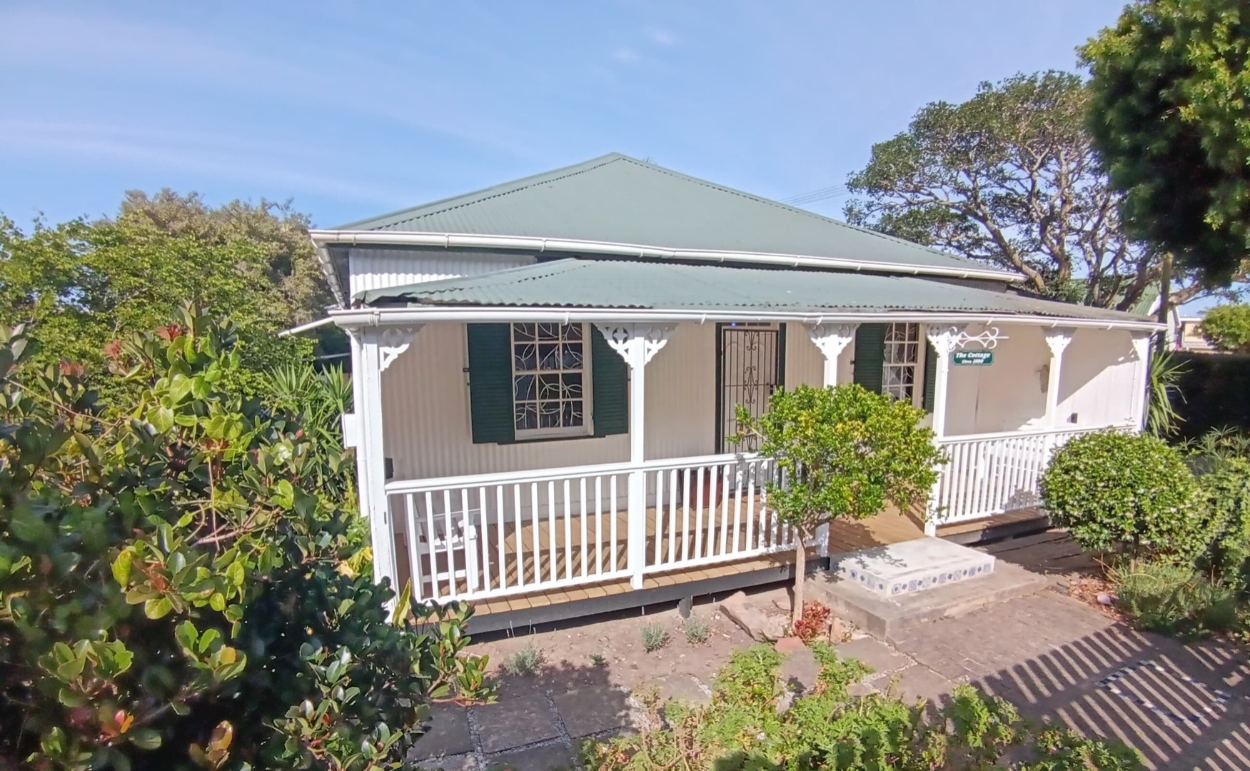Discover this charming 'Circa 1880' heritage cottage, a delightful residential/commercial property nestled in the coastal and suburban heart of Port Alfred Central, South Africa. Boasting exceptional kerb appeal, the home features a freshly painted white exterior/interior, a classic green corrugated roof, and a welcoming full-width wooden veranda with decorative posts and dark green shutters. A well-maintained white picket fence and established greenery enhance its inviting facade, complemented by an ornate security gate. The wooden sash windows with ornated steel burglar bars add to the charm of this wood and iron property.