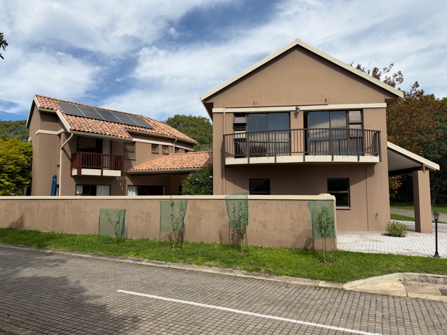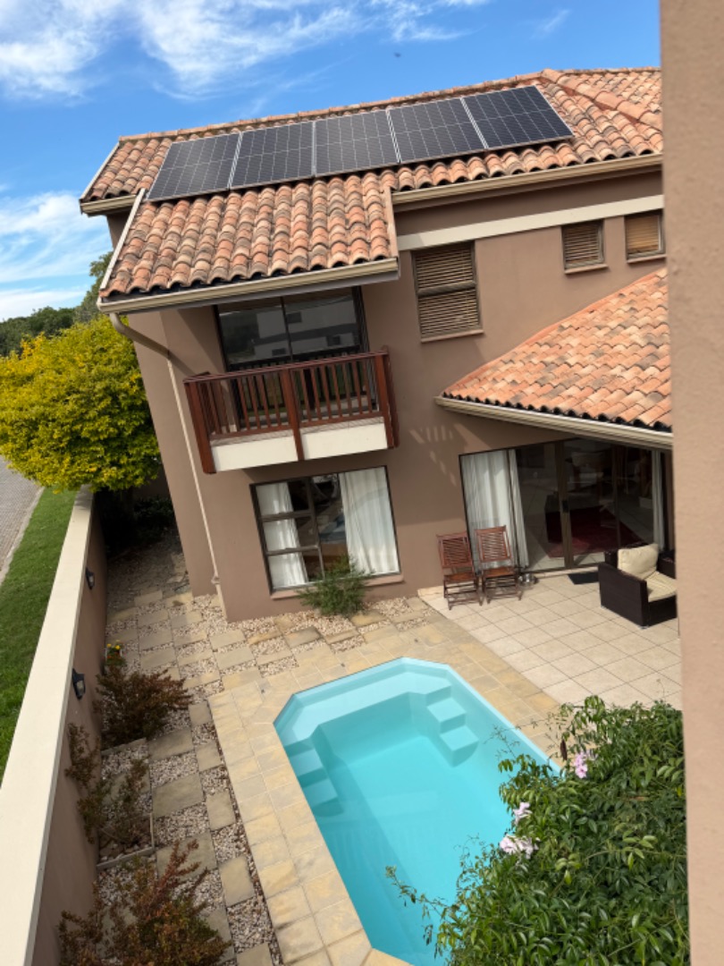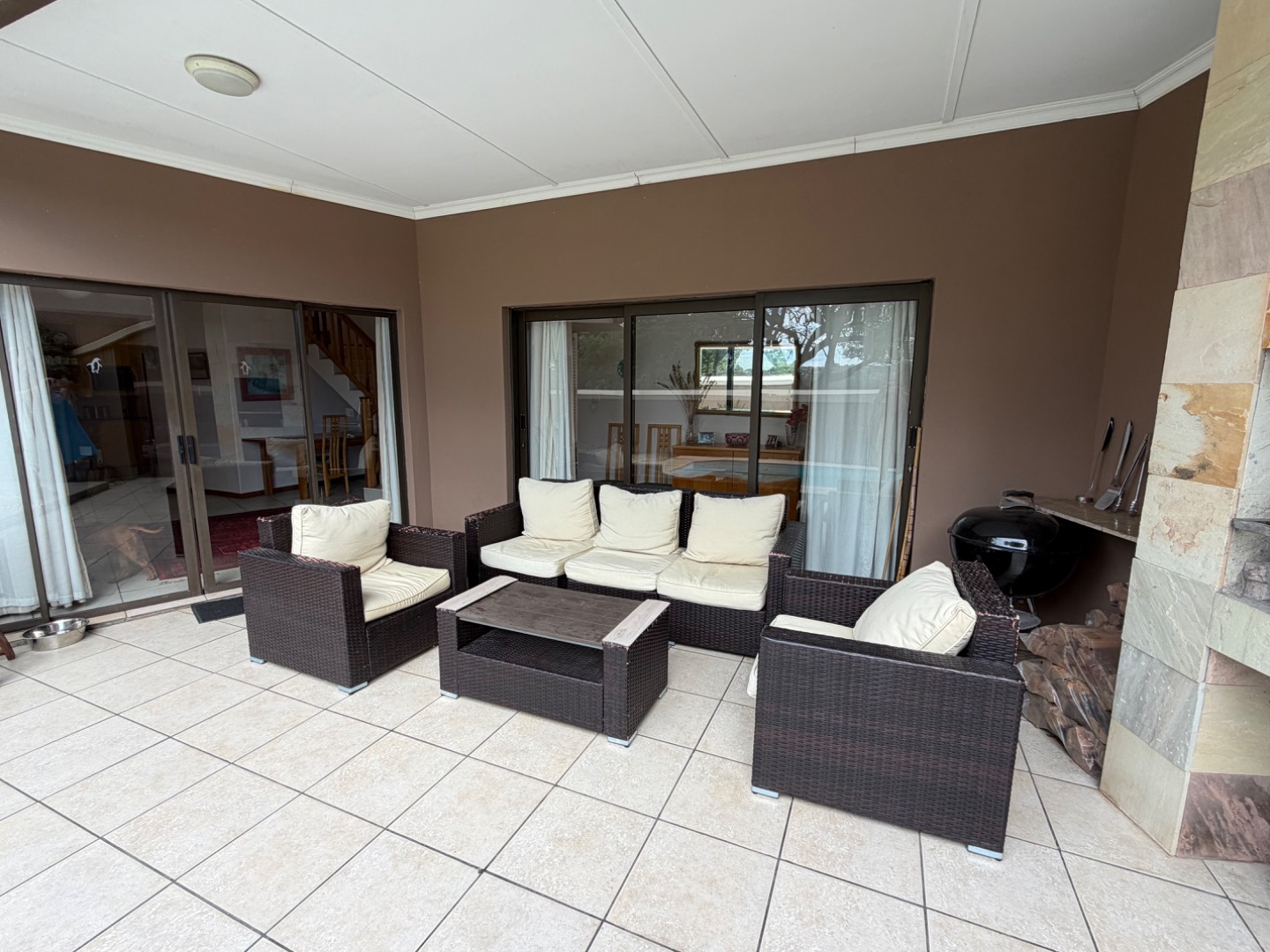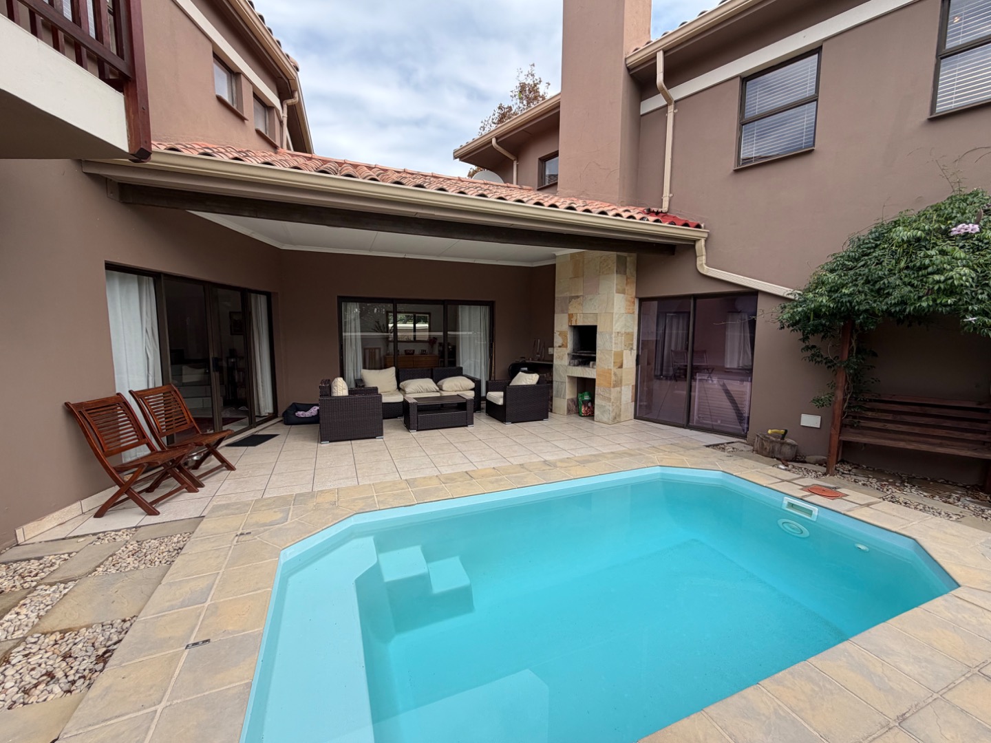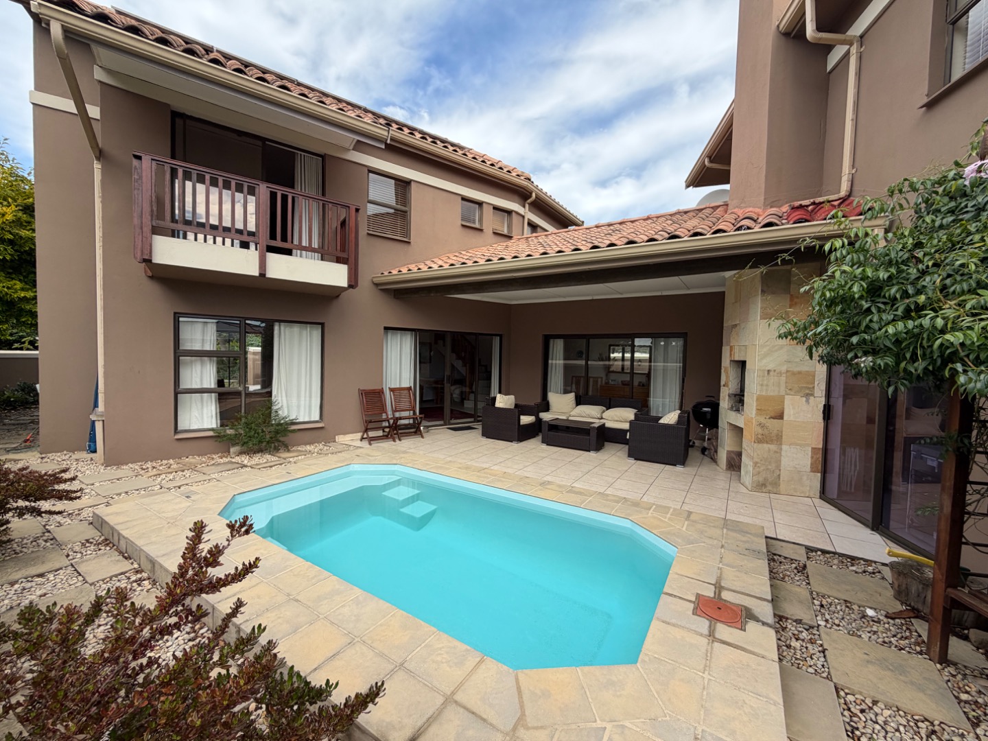Outdoor living is equally impressive, with a private swimming pool, expansive patio, and charming balconies offering scenic views from the first-floor bedrooms. The property further benefits from a beautiful, colorful, well-maintained enclosed garden and a built-in braai, ideal for entertaining. Essential utilities include a double garage on remote, a dedicated laundry area, ample storage, a 50 000L underground water reservoir, filtered drinking water tank, and modern energy solutions such as solar panels and an 8 KVA battery inverter. The estate's pet-friendly policy and club house access further enrich the lifestyle. Prospective purchasers are invited to arrange a private viewing to fully appreciate this remarkable home.