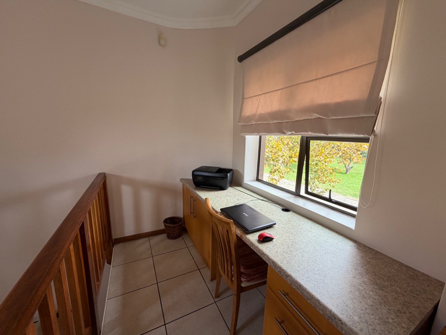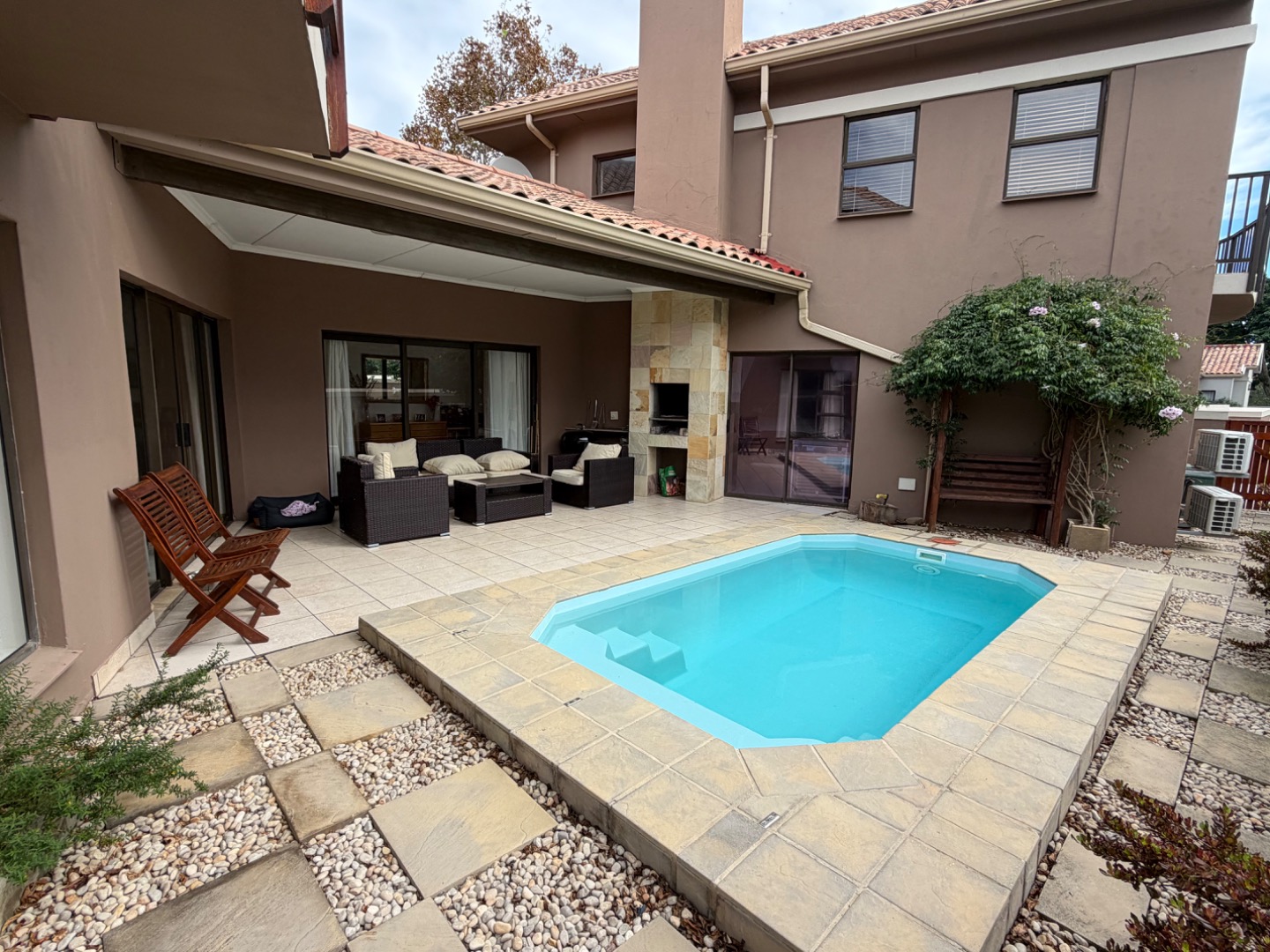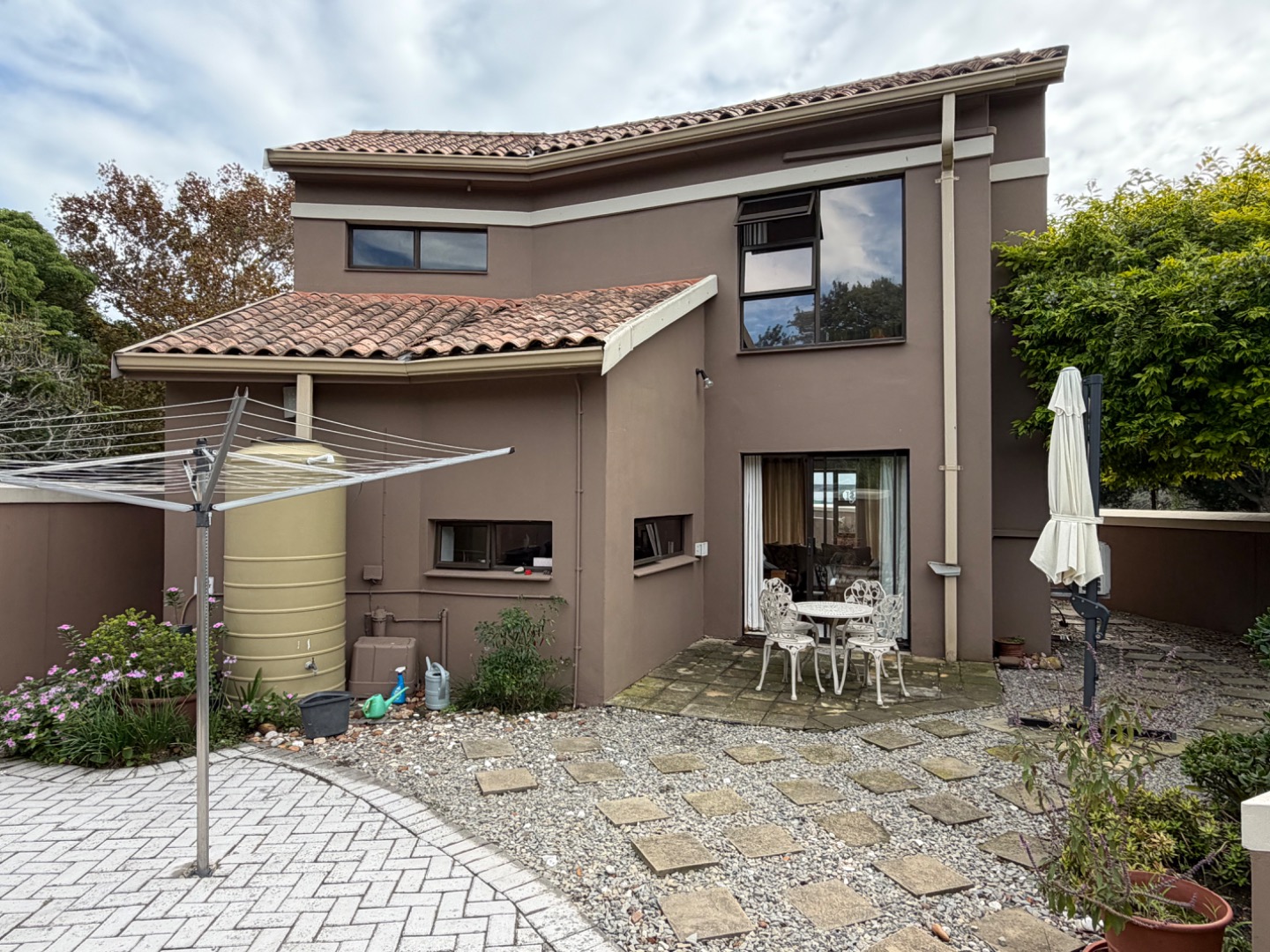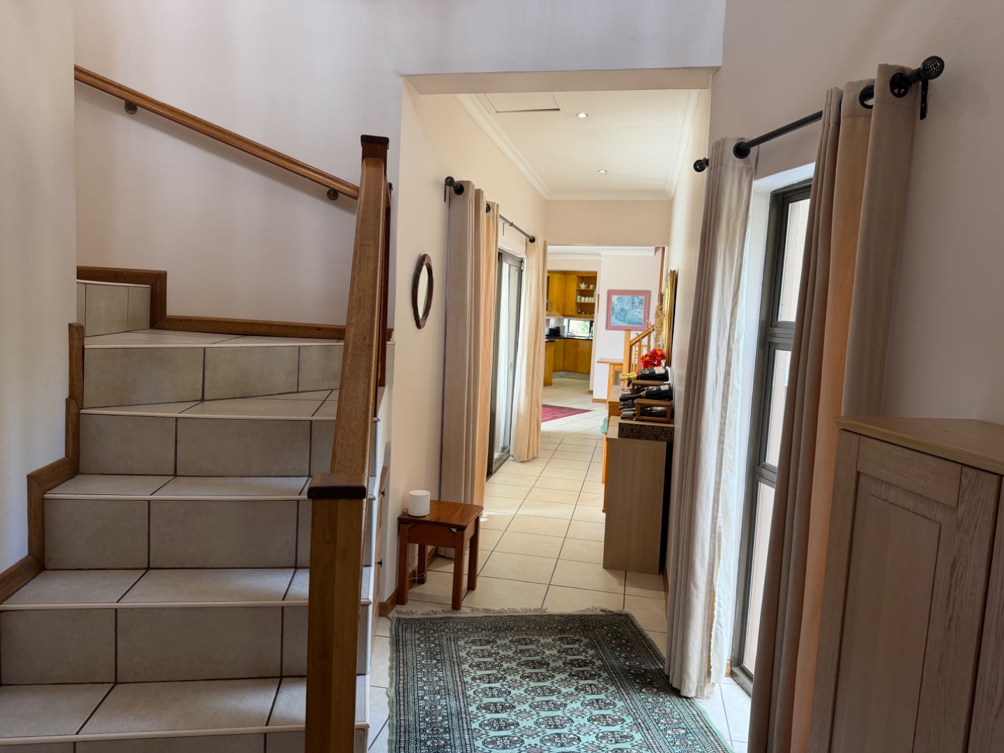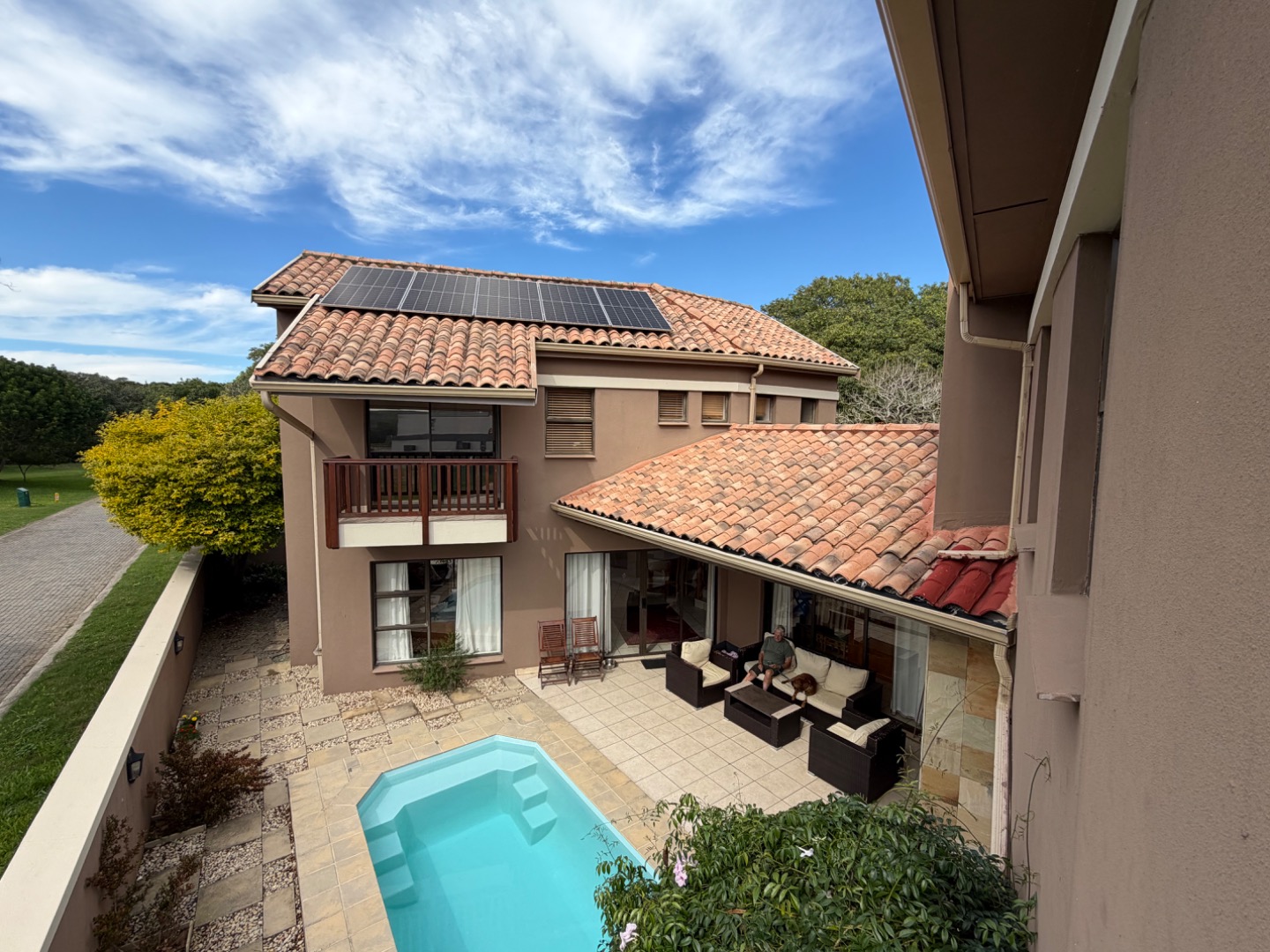 Outdoor living is equally impressive, with a private swimming pool, expansive patio, and charming balconies offering scenic views from the first-floor bedrooms. The property further benefits from a beautiful, colorful, well-maintained enclosed garden and a built-in braai, ideal for entertaining. Essential utilities include a double garage on remote, a dedicated laundry area, ample storage, a 50 000L underground water reservoir, filtered drinking water tank, and modern energy solutions such as solar panels and an 8 KVA battery inverter. The estate's pet-friendly policy and club house access further enrich the lifestyle. Prospective purchasers are invited to arrange a private viewing to fully appreciate this remarkable home.