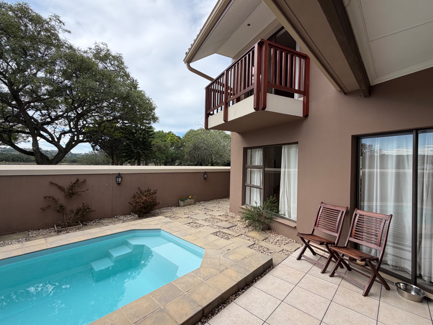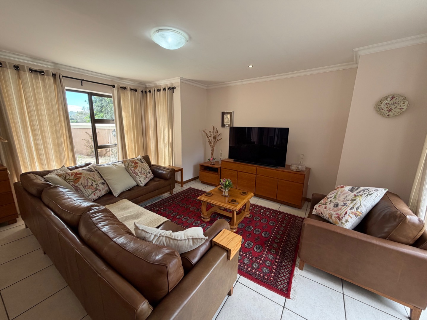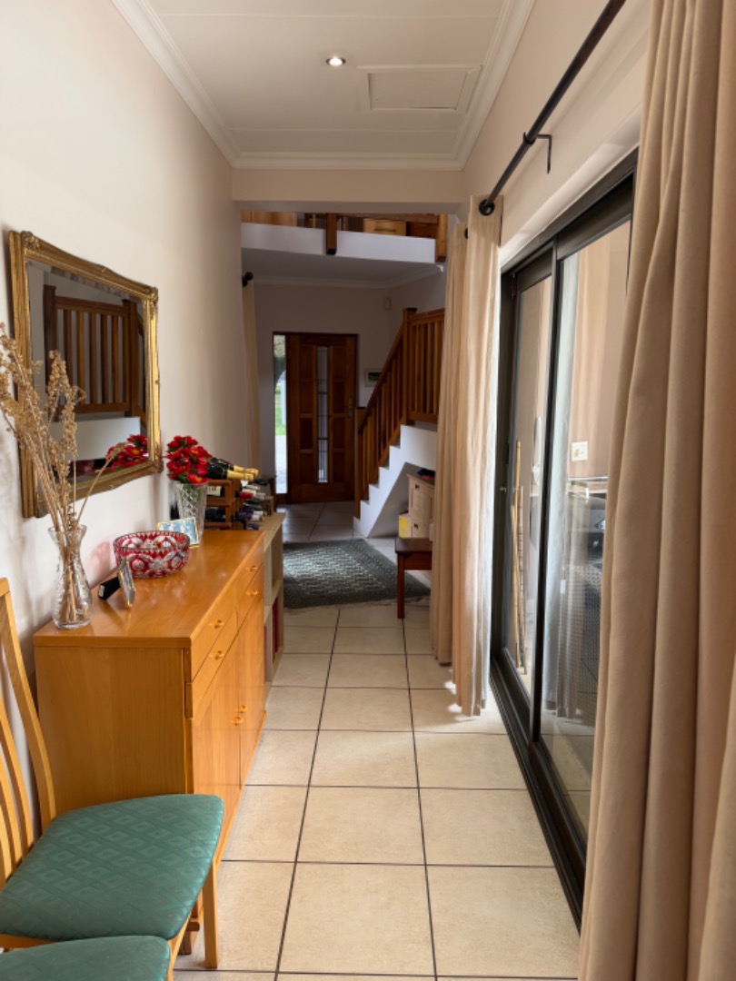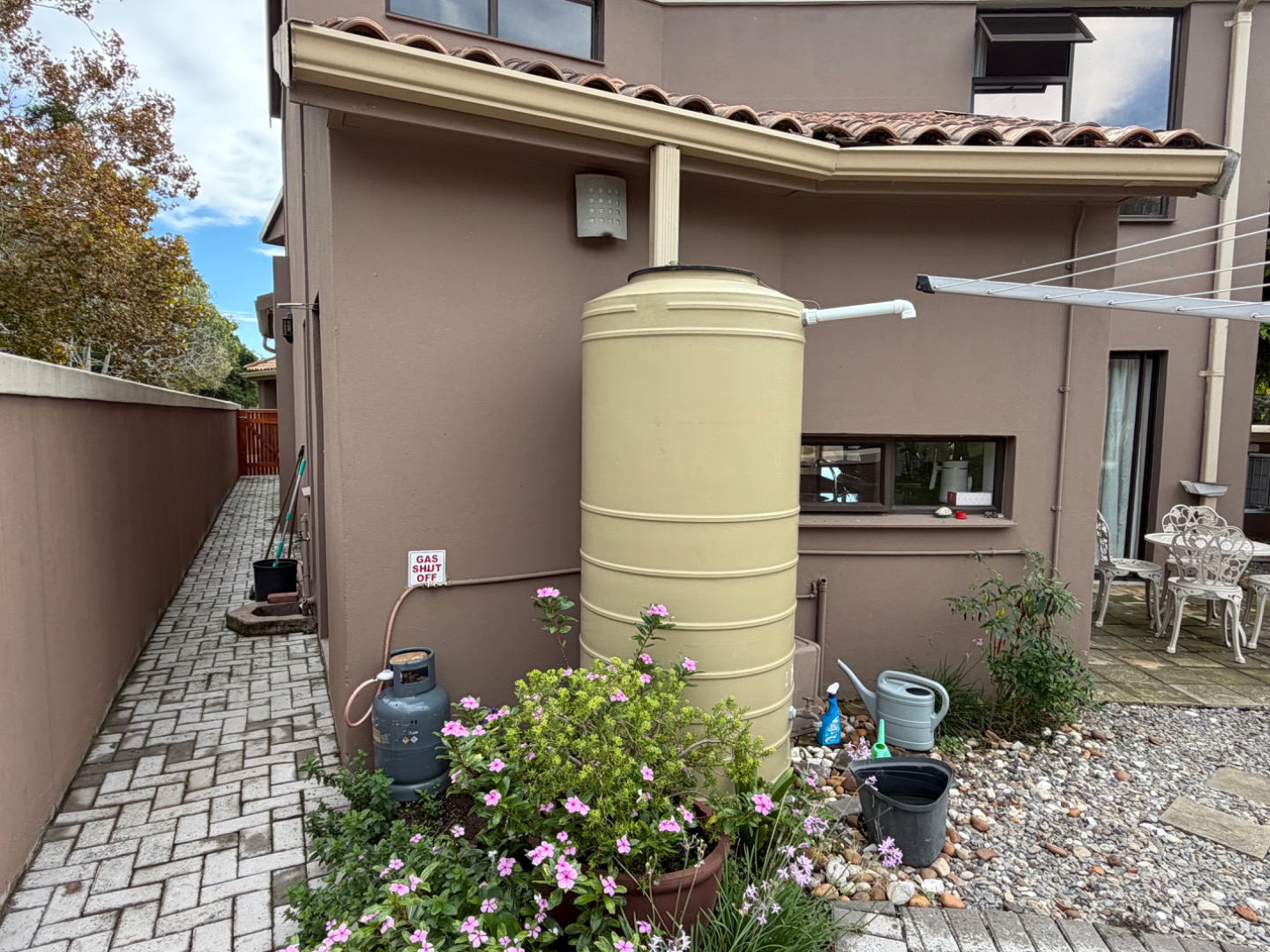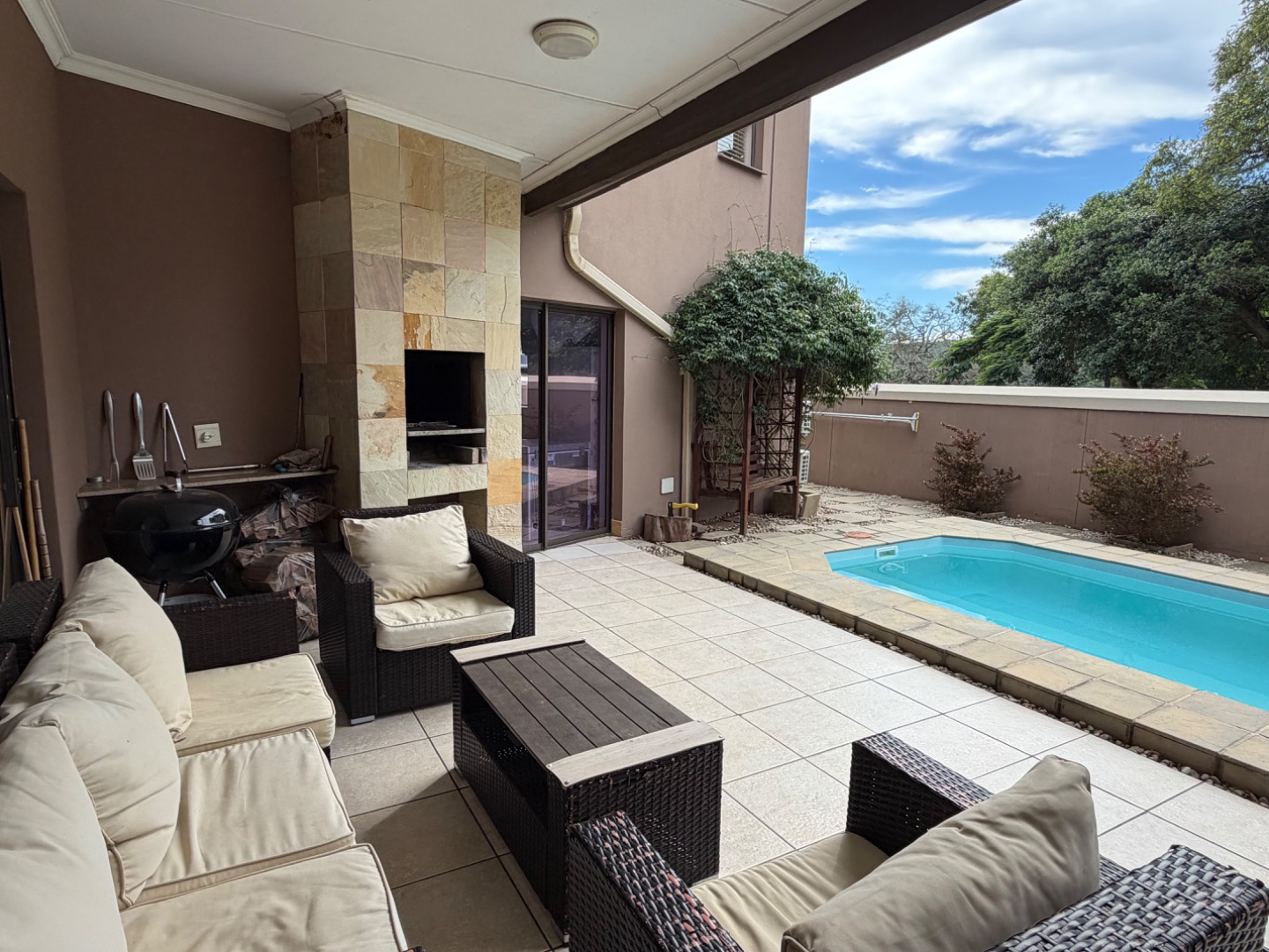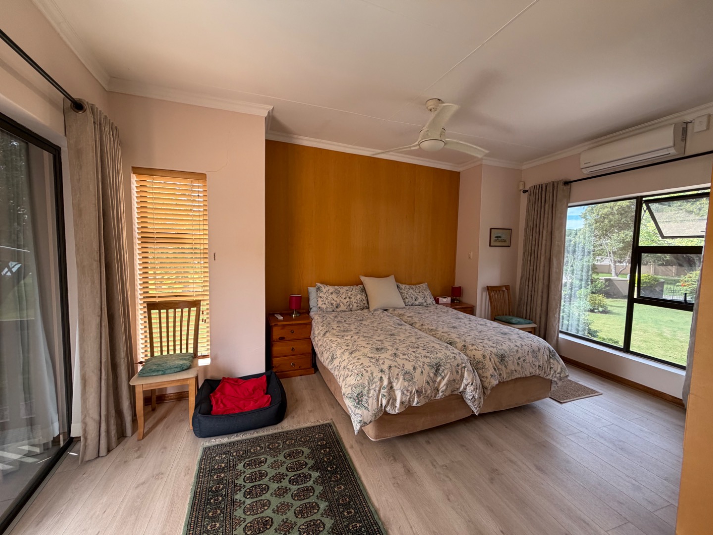 Outdoor living is equally impressive, with a private swimming pool, expansive patio, and charming balconies offering scenic views from the first-floor bedrooms. The property further benefits from a beautiful, colorful, well-maintained enclosed garden and a built-in braai, ideal for entertaining. Essential utilities include a double garage on remote, a dedicated laundry area, ample storage, a 50 000L underground water reservoir, filtered drinking water tank, and modern energy solutions such as solar panels and an 8 KVA battery inverter. The estate's pet-friendly policy and club house access further enrich the lifestyle. Prospective purchasers are invited to arrange a private viewing to fully appreciate this remarkable home.