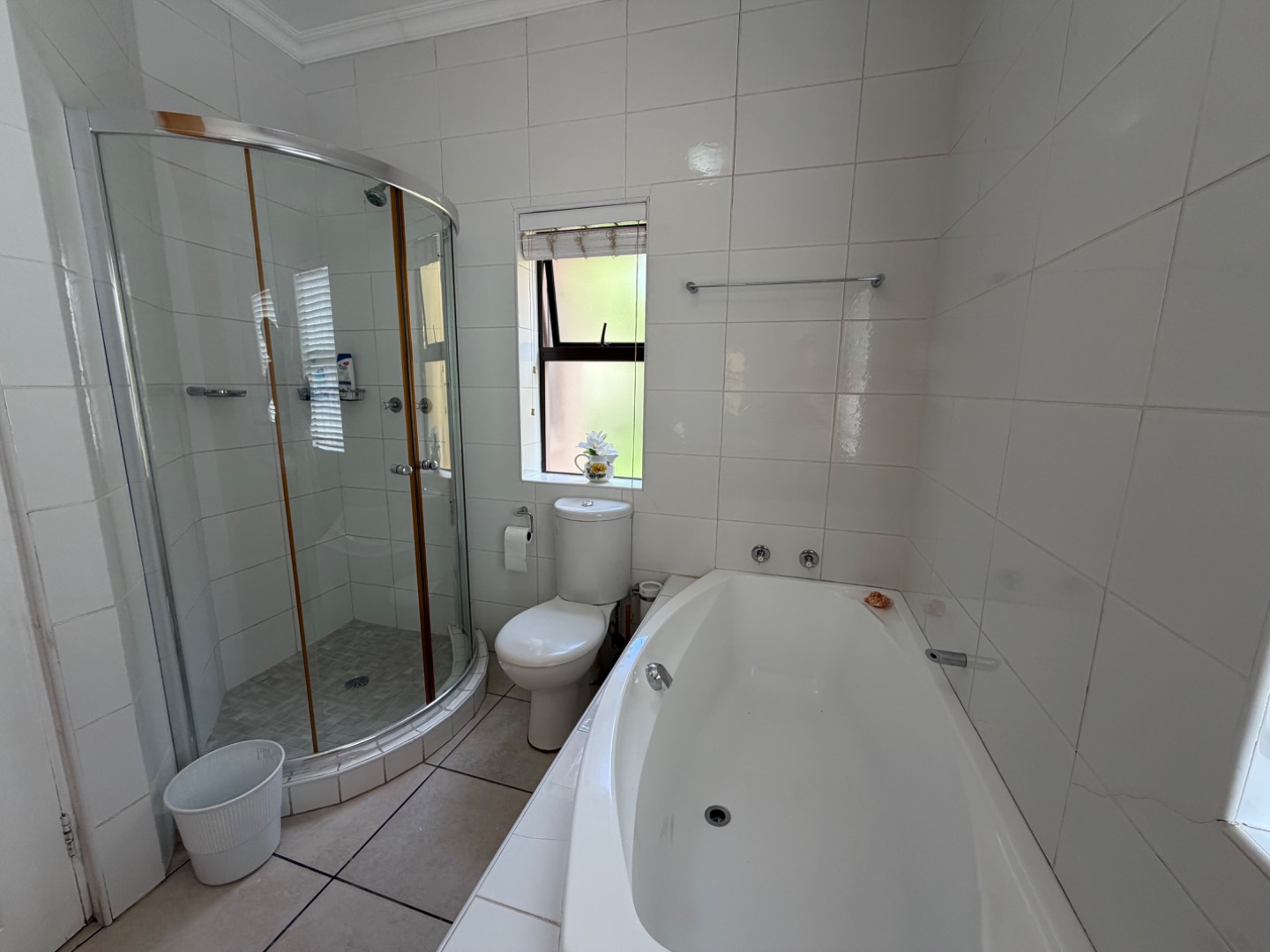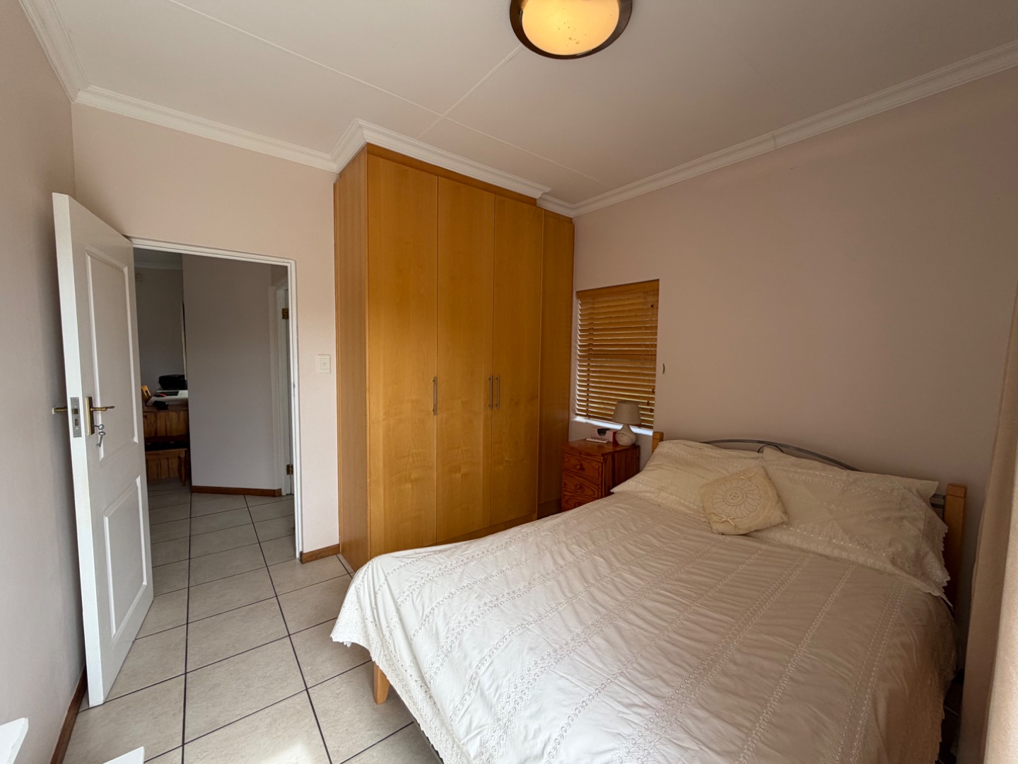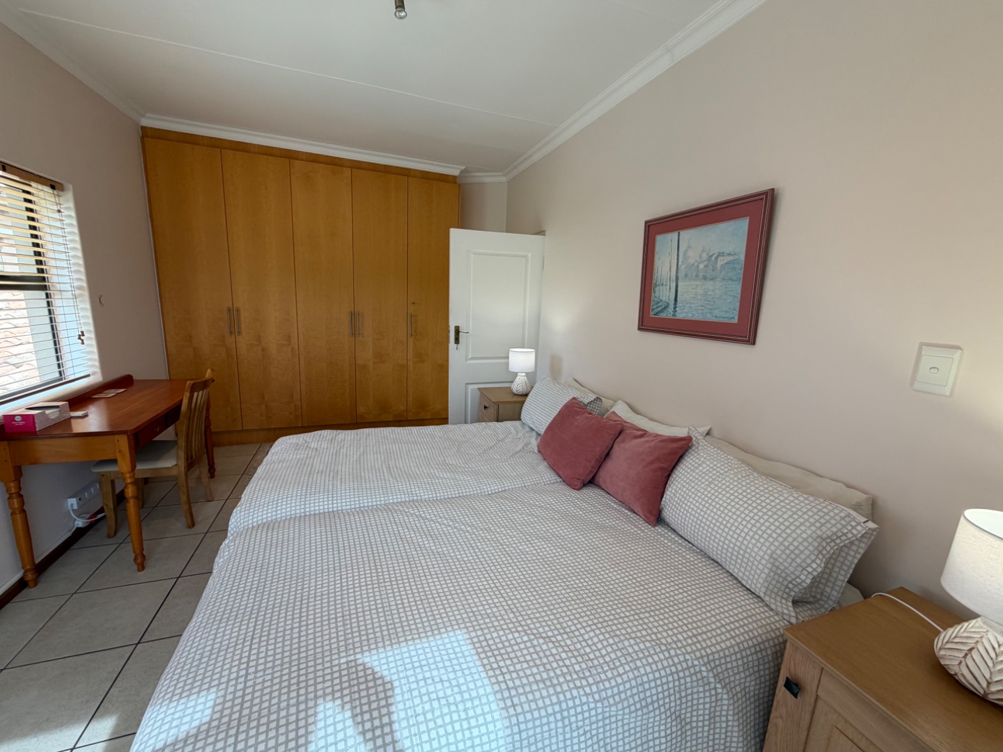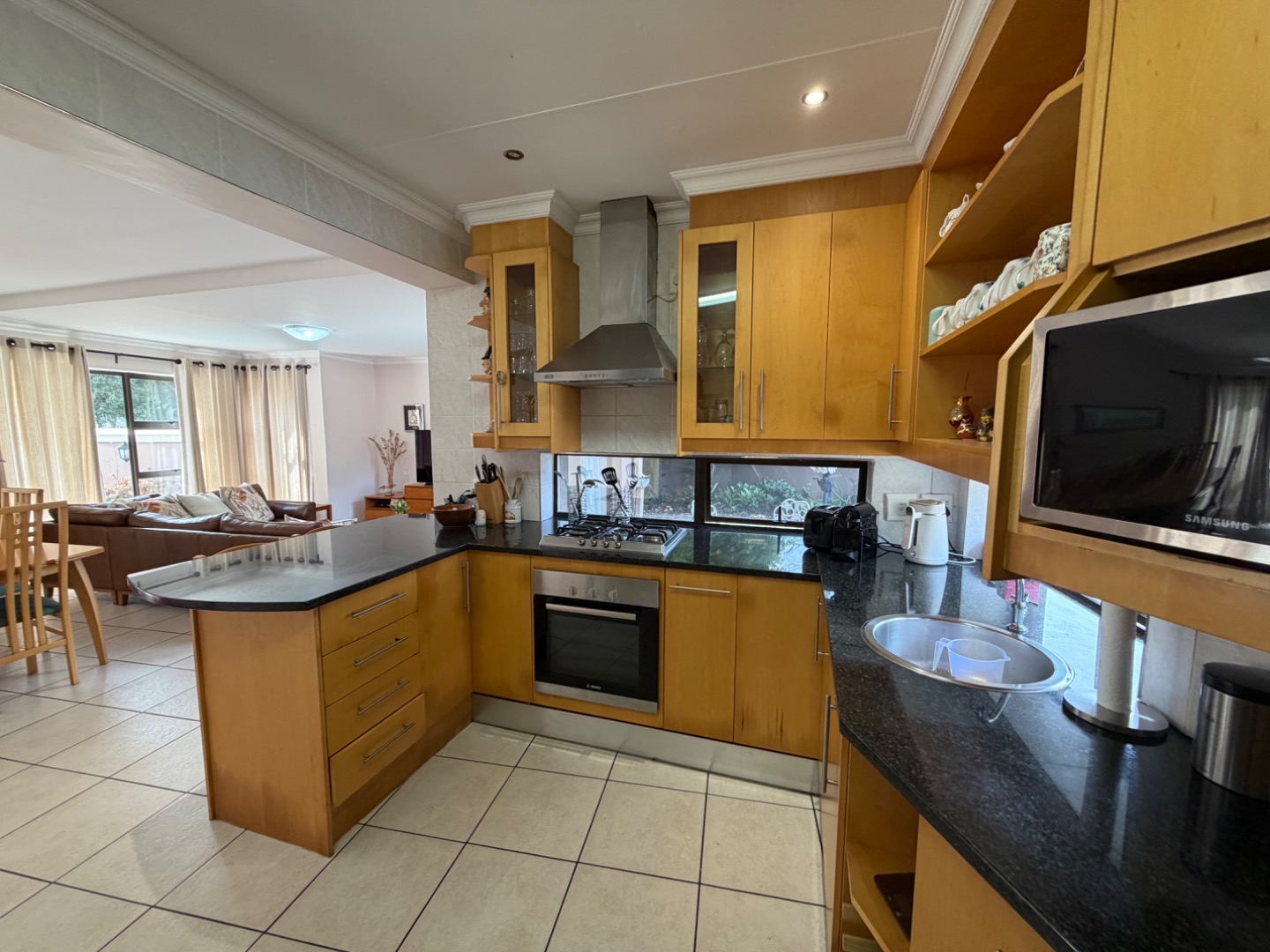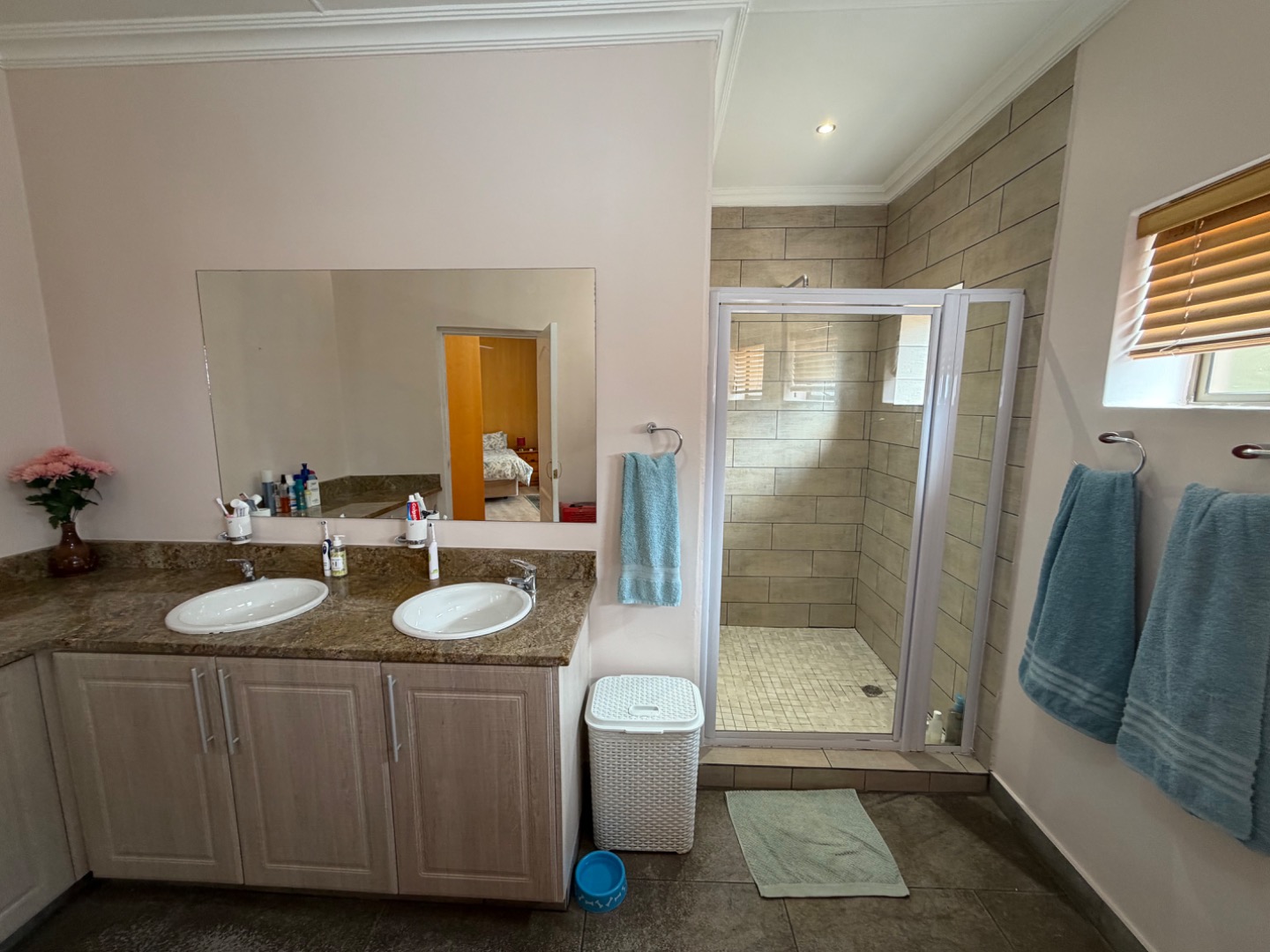 This meticulously designed residence spans 281 square meters on a double 767 square meter erf, featuring three well-appointed bedrooms with air conditioning in each bedroom and two and a half bathrooms, including a private ensuite and guest toilet. The interior boasts an open-plan, contemporary custom-made kitchen with granite tops, gas hob with electric oven, scullery/laundry configuration, connecting with the elegant TV lounge and dining room. Practical amenities such as a dedicated study and sliding doors enhance comfort and functionality.