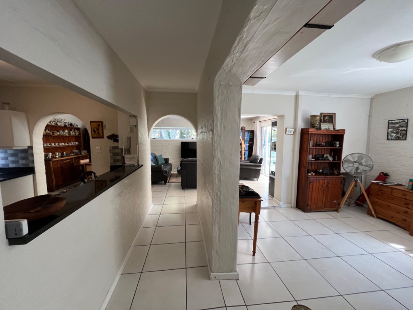 North facing, the pool and patio area offer privacy, and wind protection. The open plan design is great and an undercover patio off the living room, with built in braai, is ideal for relaxing and entertaining. The home has a large dining area or home office, and enjoys 3 bedrooms, all with fans, as well as 2 bathrooms with the main being a full en suite bathroom. Two other bedrooms share a 2nd bathroom with shower, basin and loo. The kitchen is spacious with granite tops, plenty of BIC, and all the necessary plumbed appliances including dishwasher, washing machine and tumble drier. The garage leads into a utiluty room area and into the kitchen, for convenience.