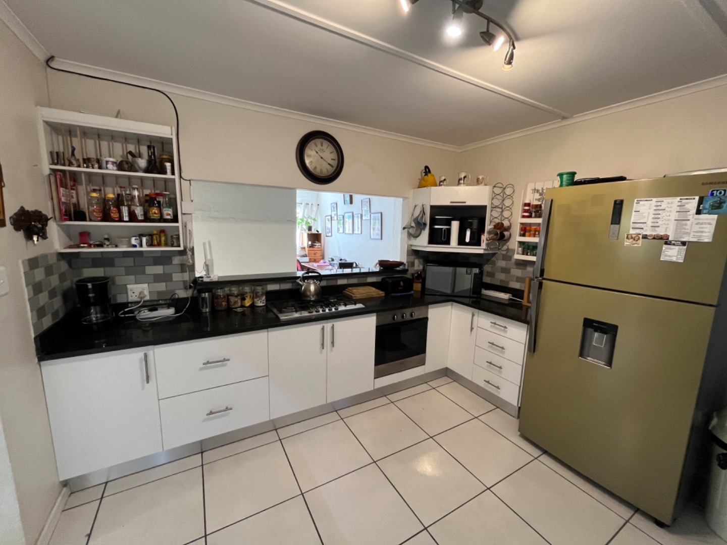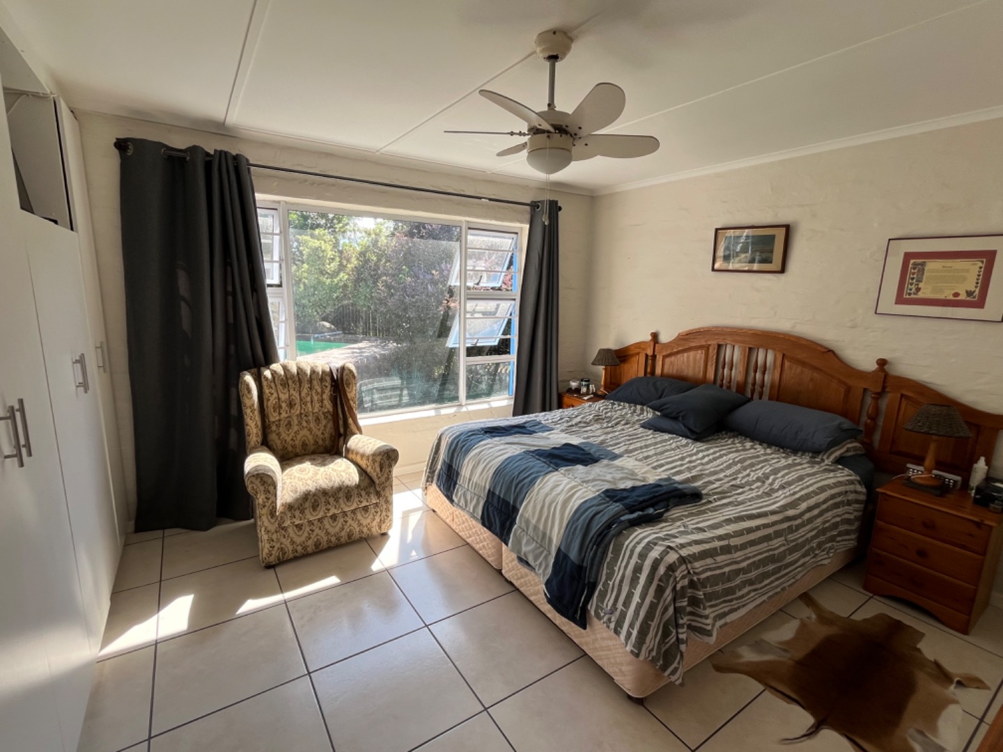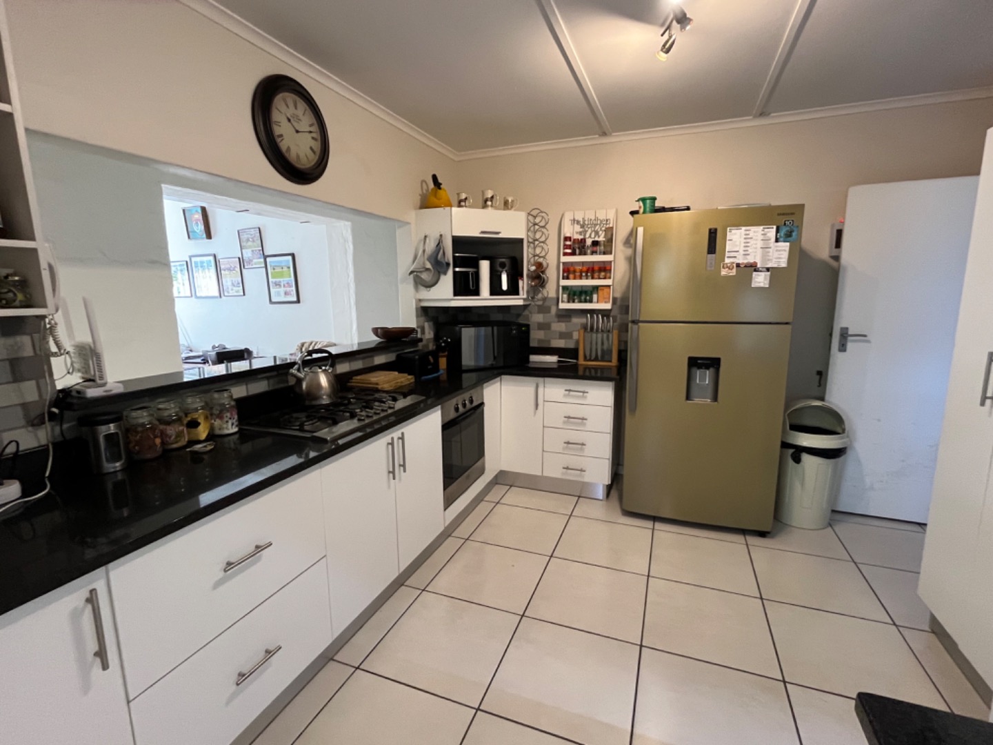 North facing, the pool and patio area offer privacy, and wind protection. The open plan design is great and an undercover patio off the living room, with built in braai, is ideal for relaxing and entertaining. The home has a large dining area or home office, and enjoys 3 bedrooms, all with fans, as well as 2 bathrooms with the main being a full en suite bathroom. Two other bedrooms share a 2nd bathroom with shower, basin and loo. The kitchen is spacious with granite tops, plenty of BIC, and all the necessary plumbed appliances including dishwasher, washing machine and tumble drier. The garage leads into a utiluty room area and into the kitchen, for convenience.