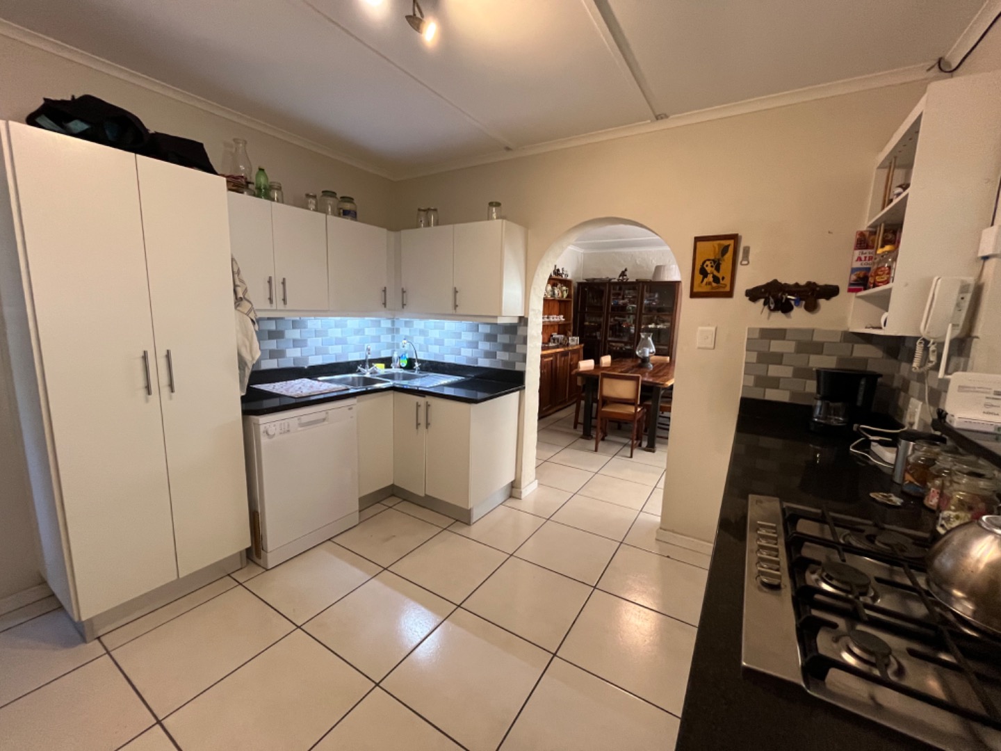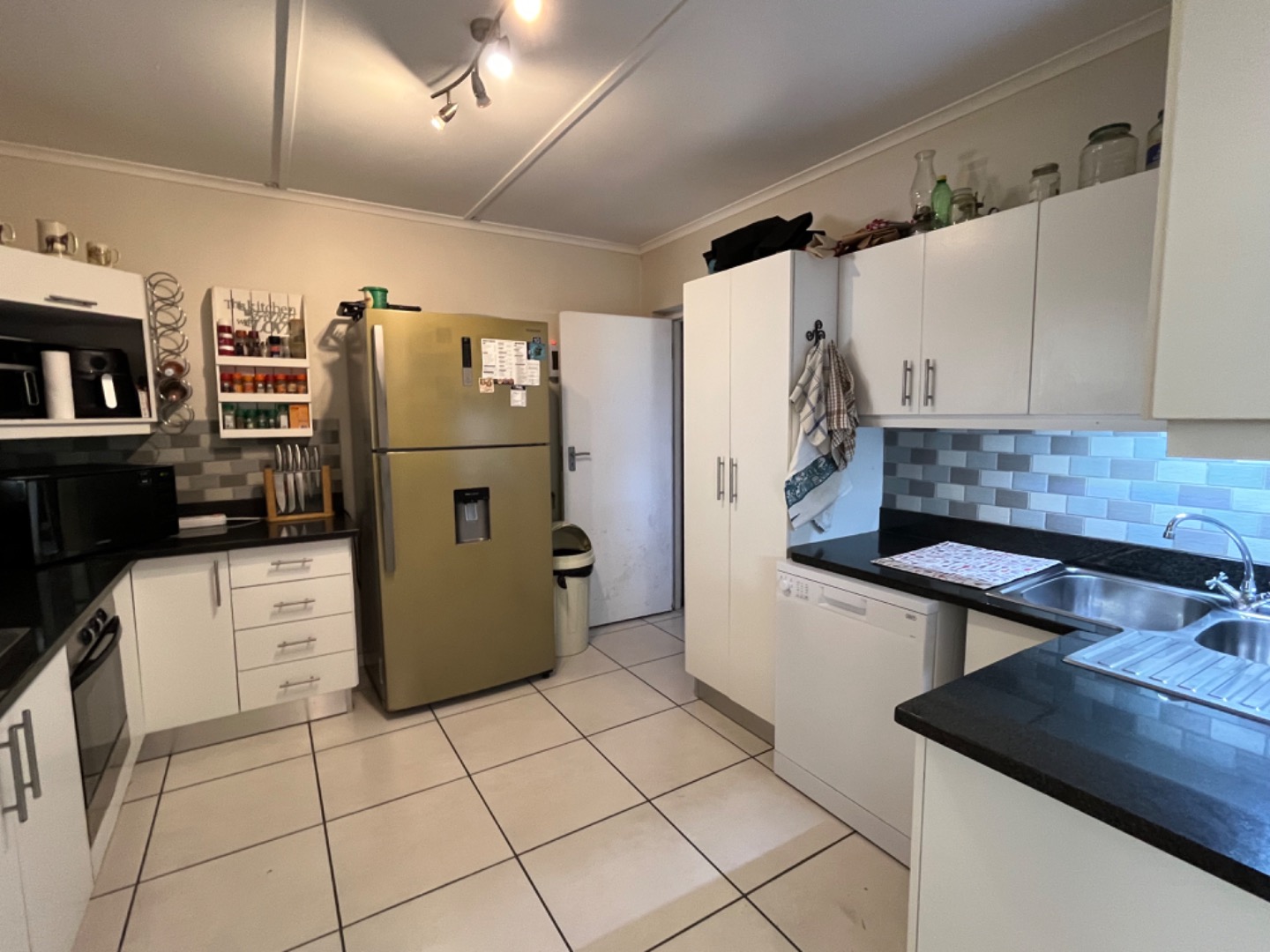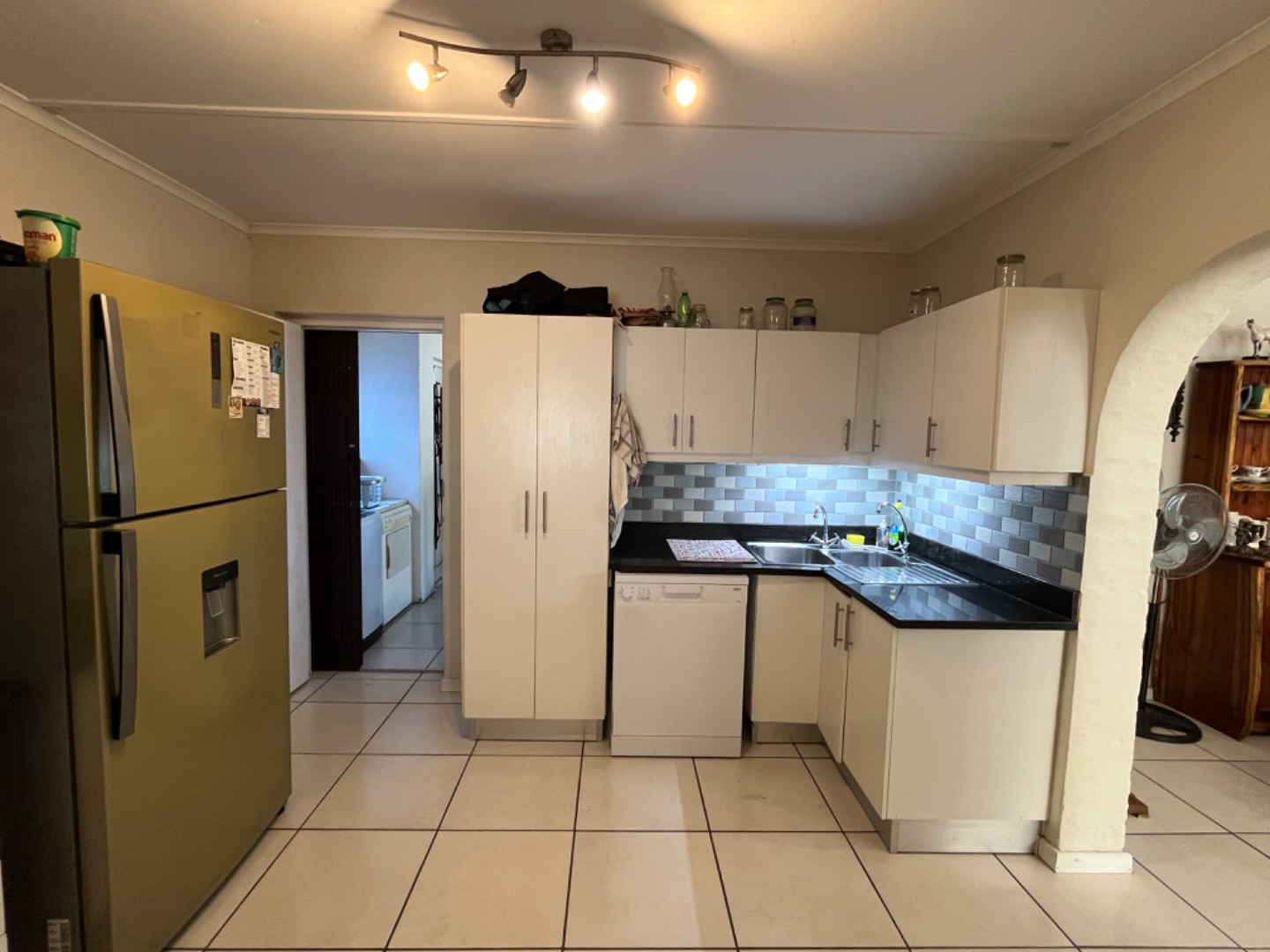 North facing, the pool and patio area offer privacy, and wind protection. The open plan design is great and an undercover patio off the living room, with built in braai, is ideal for relaxing and entertaining. The home has a large dining area or home office, and enjoys 3 bedrooms, all with fans, as well as 2 bathrooms with the main being a full en suite bathroom. Two other bedrooms share a 2nd bathroom with shower, basin and loo. The kitchen is spacious with granite tops, plenty of BIC, and all the necessary plumbed appliances including dishwasher, washing machine and tumble drier. The garage leads into a utiluty room area and into the kitchen, for convenience.