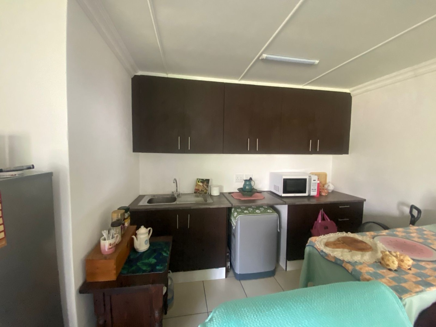 Kitchenette: Equipped with ample dark wood cabinetry and a sink